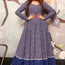 This gown is crafted from soft crepe fabric, featuring a stunning blue base with intricate geometric and floral prints in shades of red and white. The long-sleeved design and flared silhouette add grace, while the tiered hemline enhances its flowy appeal. At the back, the gown showcases a stylish deep cut with tie-up detailing and playful layered fabric tassels, making it a chic yet comfortable choice for casual outings or festive gatherings.