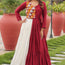 This outfit showcases a bold and contemporary twist on ethnic elegance with a dual-tone design. The ensemble features a striking maroon one-side layered shrug-style kurti, paired with a contrasting ivory flared lehenga that is subtly bordered with golden zari detailing. The look is elevated by a vibrant half-panel sleeveless jacket, richly adorned with traditional mirror and thread embroidery in yellow, white, red, and green motifs that capture the festive spirit.