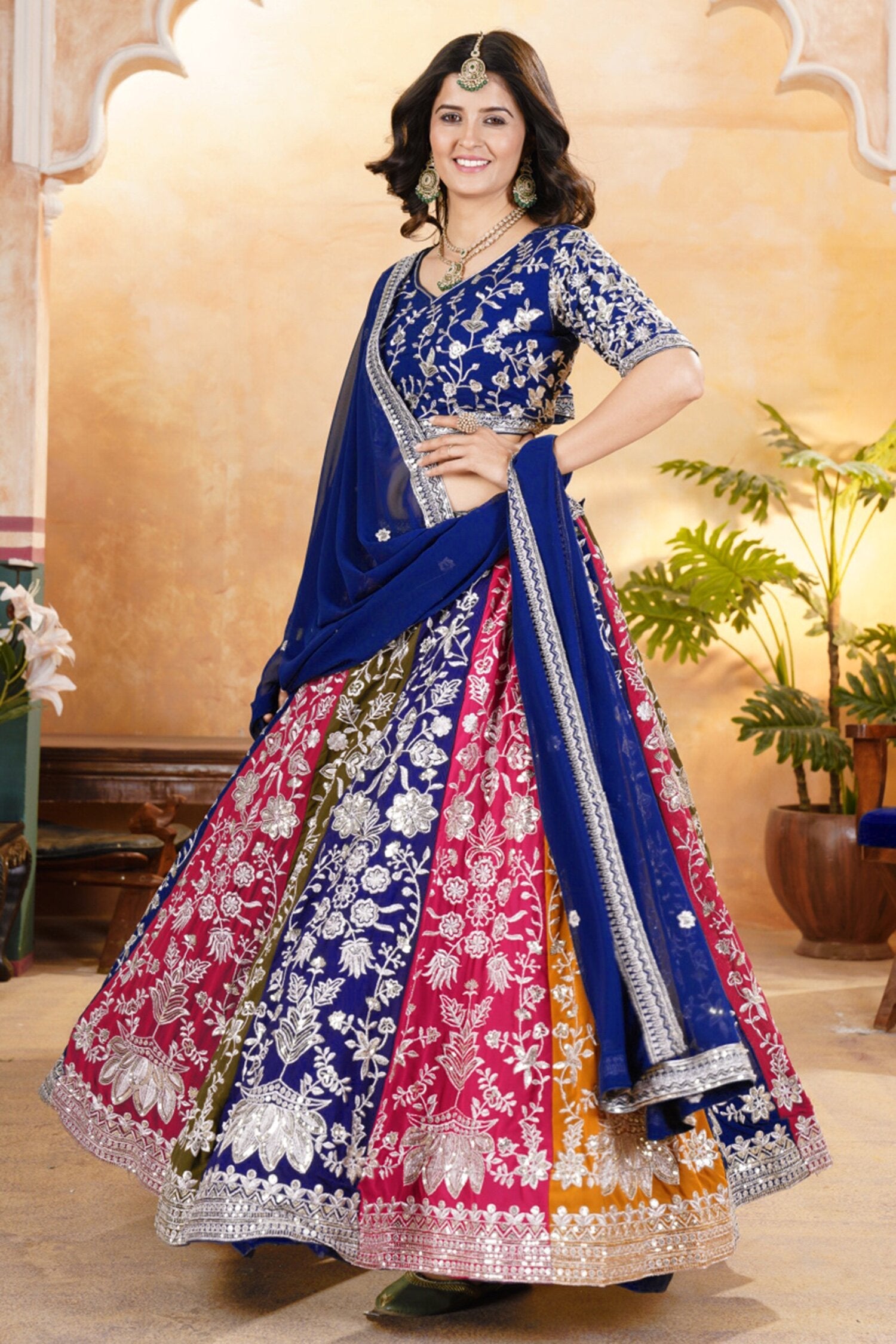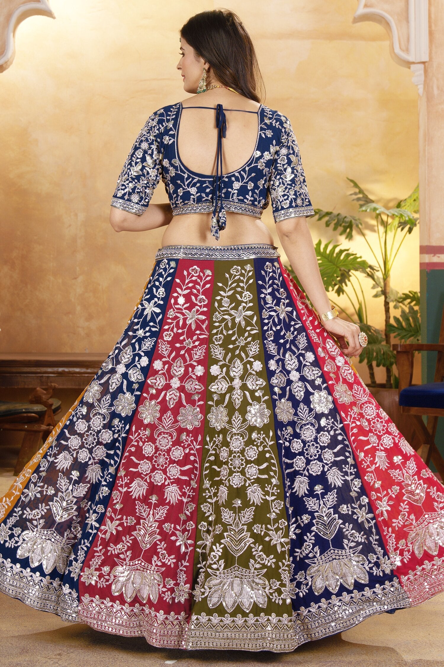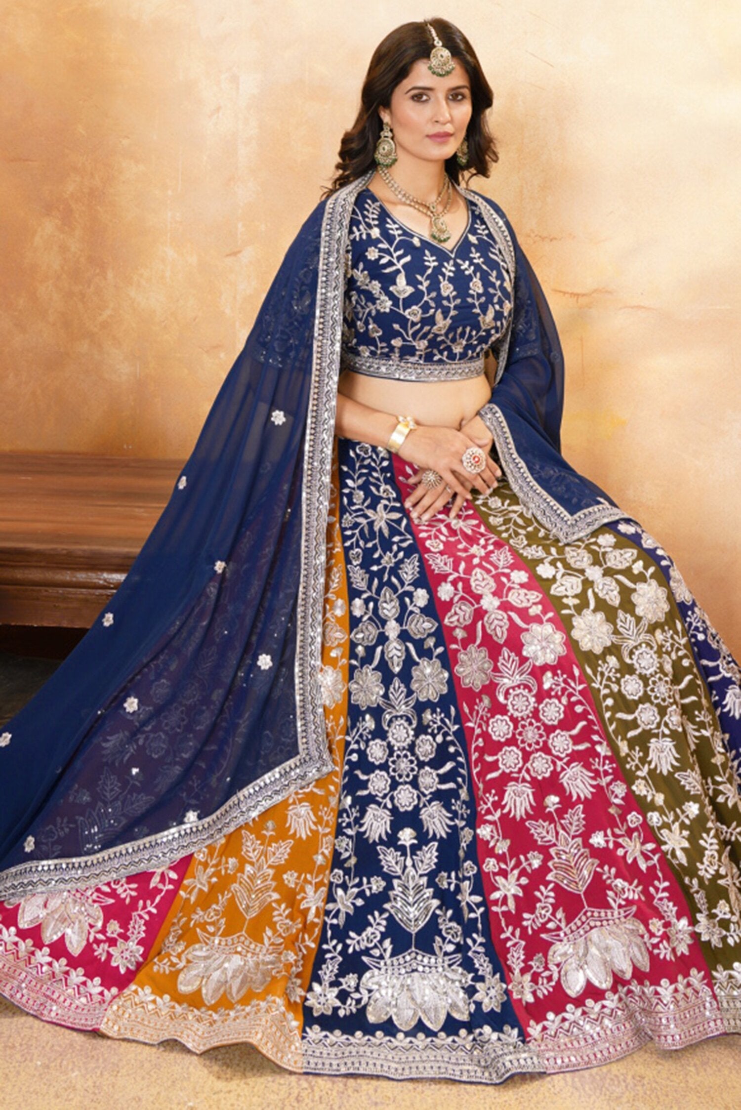 Make a statement in this stunning multi-color lehenga crafted from faux georgette, adorned with intricate embroidery sequin design work. Featuring a 42-inch waist and height, with a 4.5-meter flair supported by two layers of cancan and canvas, it offers dramatic elegance for special occasions.