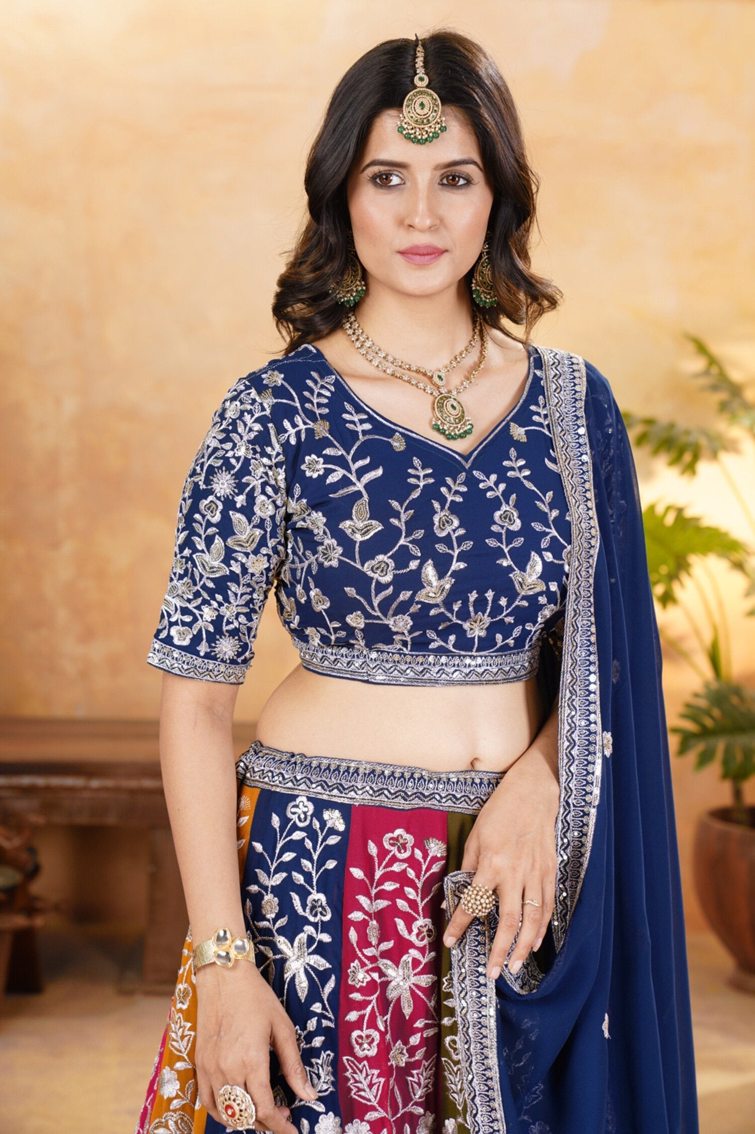 Completing the look is a navy-blue faux georgette dupatta, beautifully embellished with embroidery sequin design work. This graceful accessory adds the perfect finishing touch to your festive or bridal ensemble.