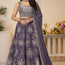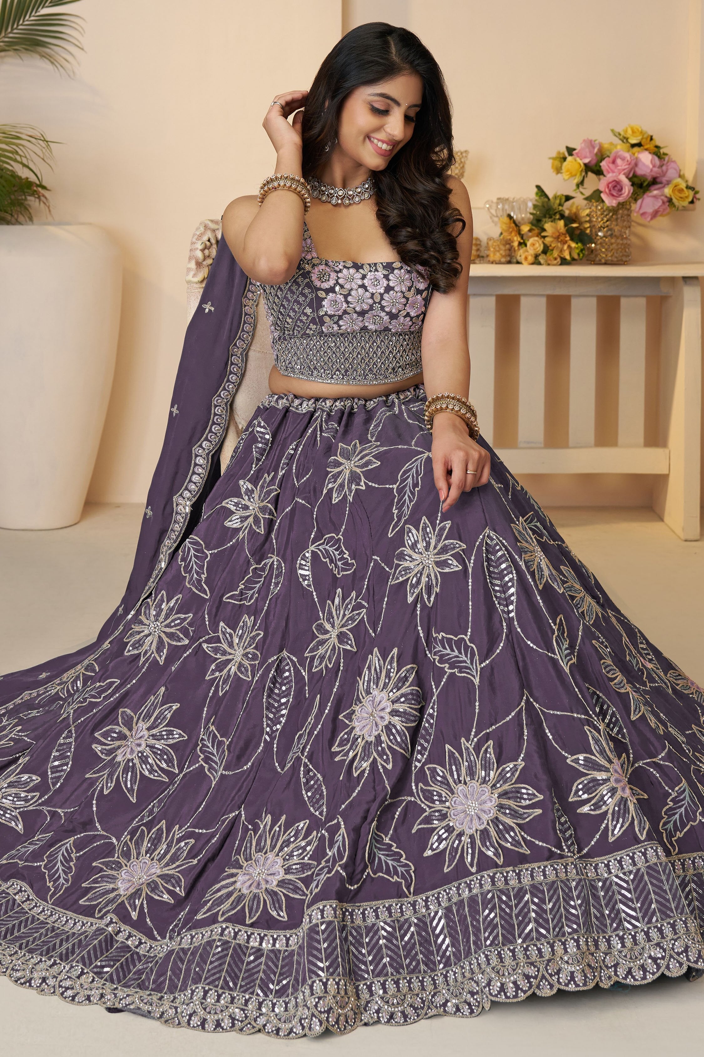 Step into sophistication with this purple satin silk lehenga, crafted to embody graceful elegance and contemporary beauty. Adorned with delicate floral embroidery, intricate thread work, shimmering sequins, and charming motifs, it offers a mesmerizing visual appeal.