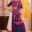 This Navratri lehenga choli set showcases a stunning fusion of bold colors and intricate embroidery. The lehenga is a beautiful blend of navy blue, magenta, and cream panels, bordered with golden lace for a regal finish.