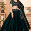 This gorgeous ensemble in rich forest green is crafted from soft georgette fabric, creating a fluid and voluminous lehenga with elegant flare. The lehenga is designed with broad pleats that enhance its movement, and the border is beautifully detailed with a printed pattern that adds contrast and texture.