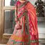 The beautifully crafted rani pink blouse complements the vibrant multi-color lehenga.