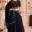 This stunning cotton lehenga choli is designed in bold festive shades, featuring a multi-color panel skirt with deep hues of maroon, green, navy, and black. The golden lace border at the hem adds a rich finishing touch.