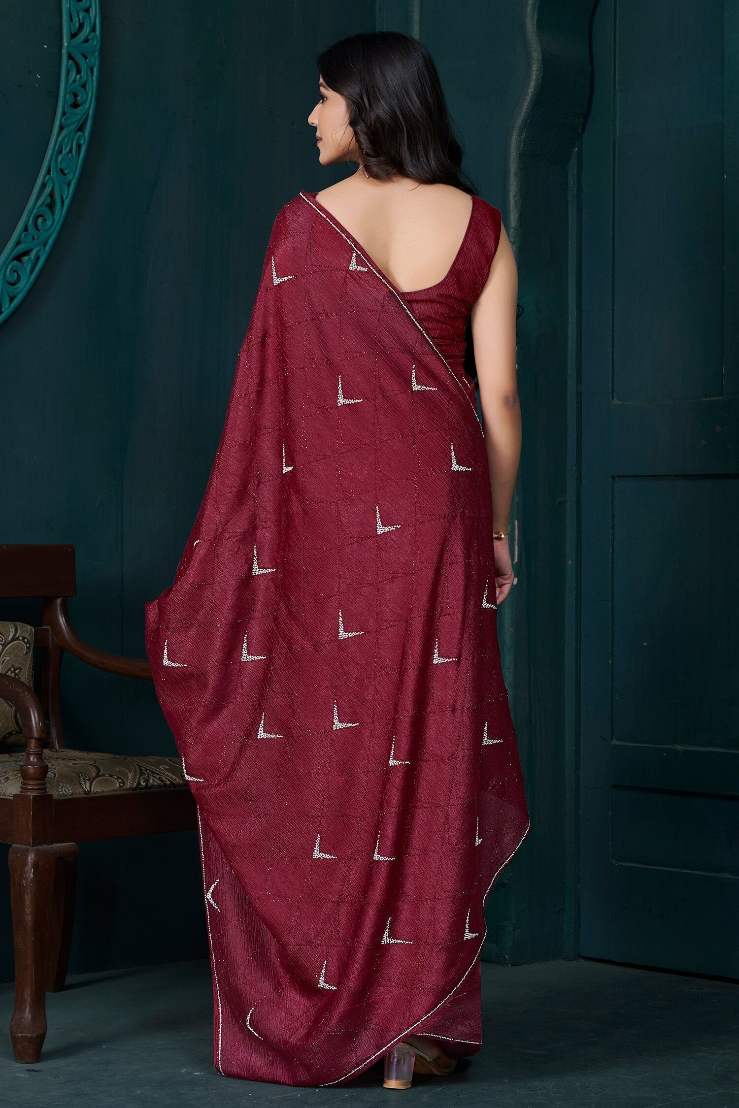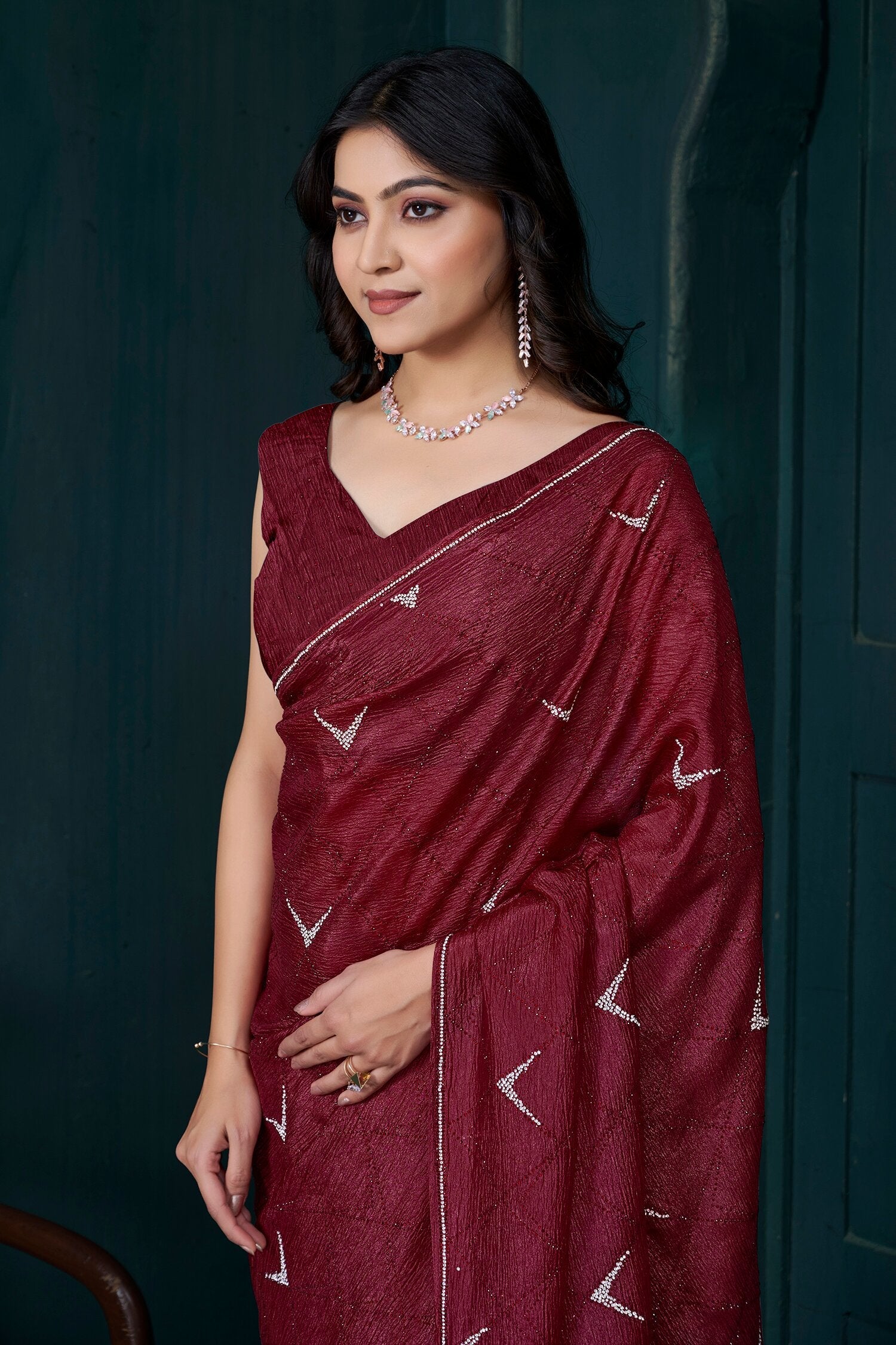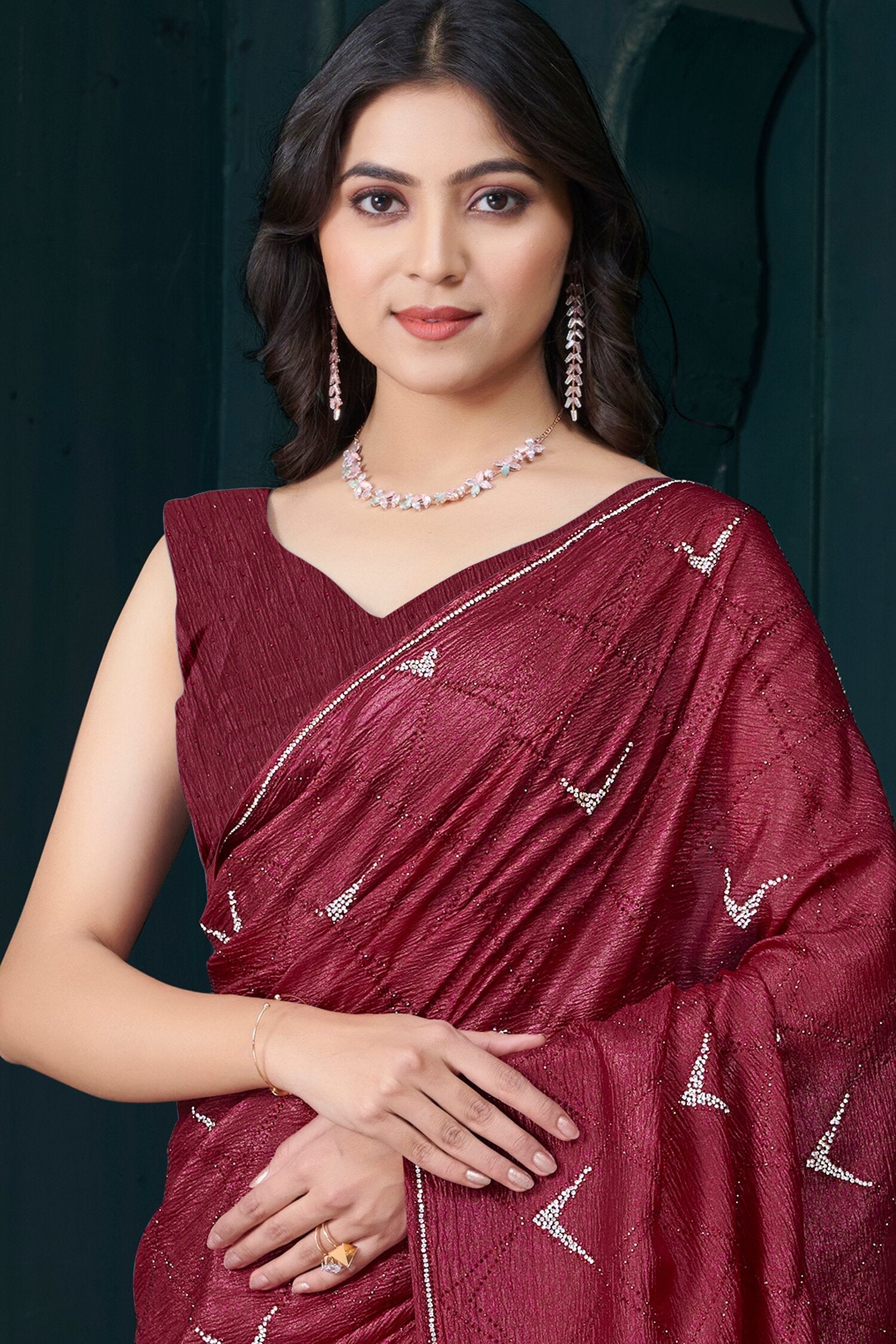Attractive Maroon Diamond Work Crepe Party Wear Saree With Blouse