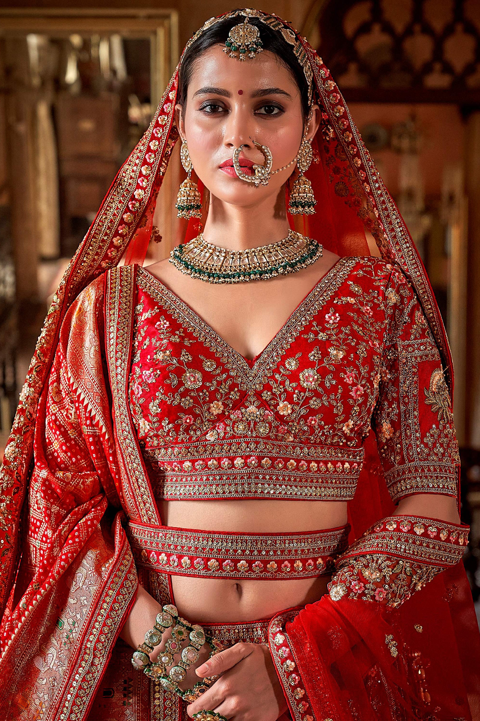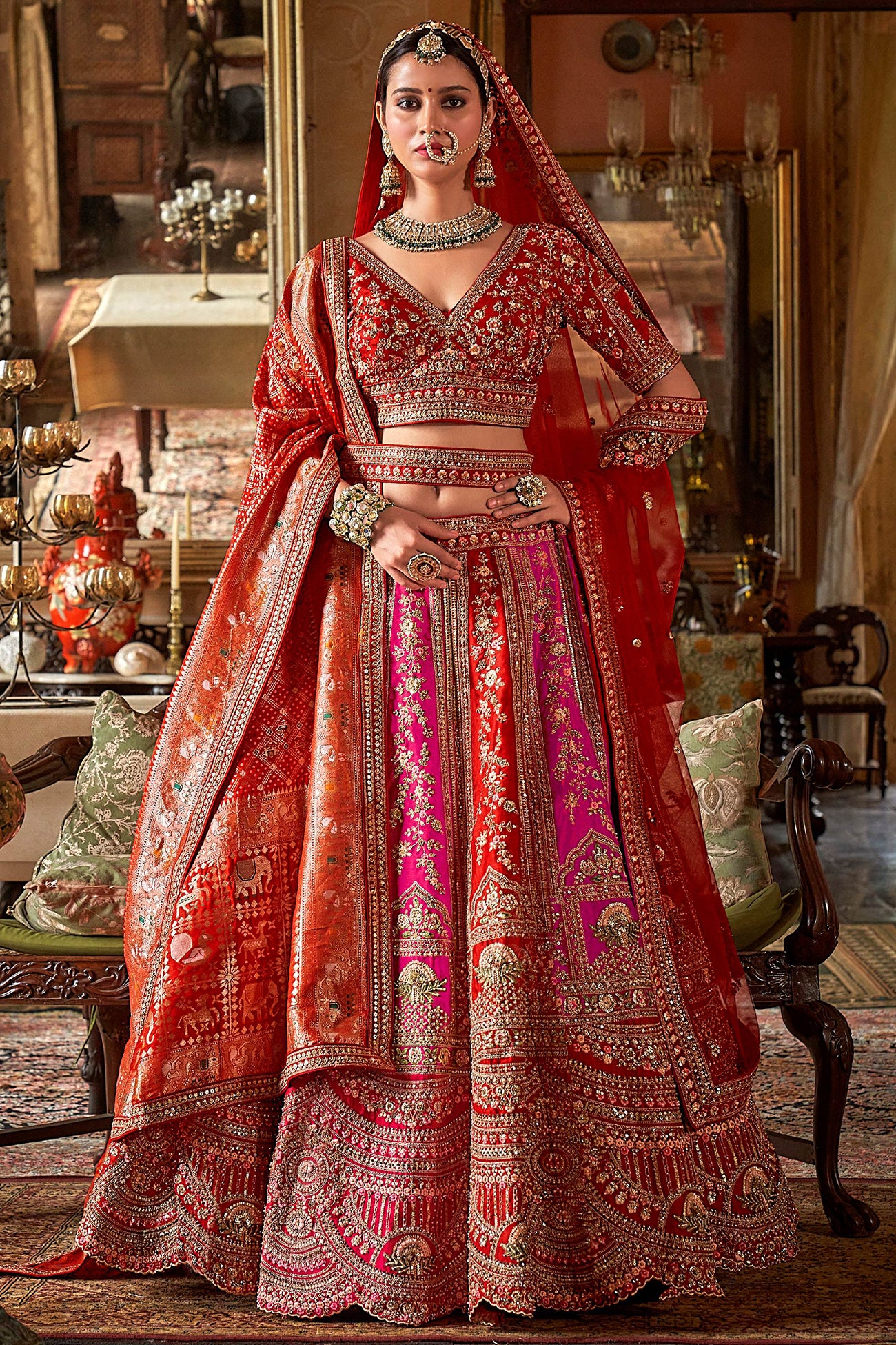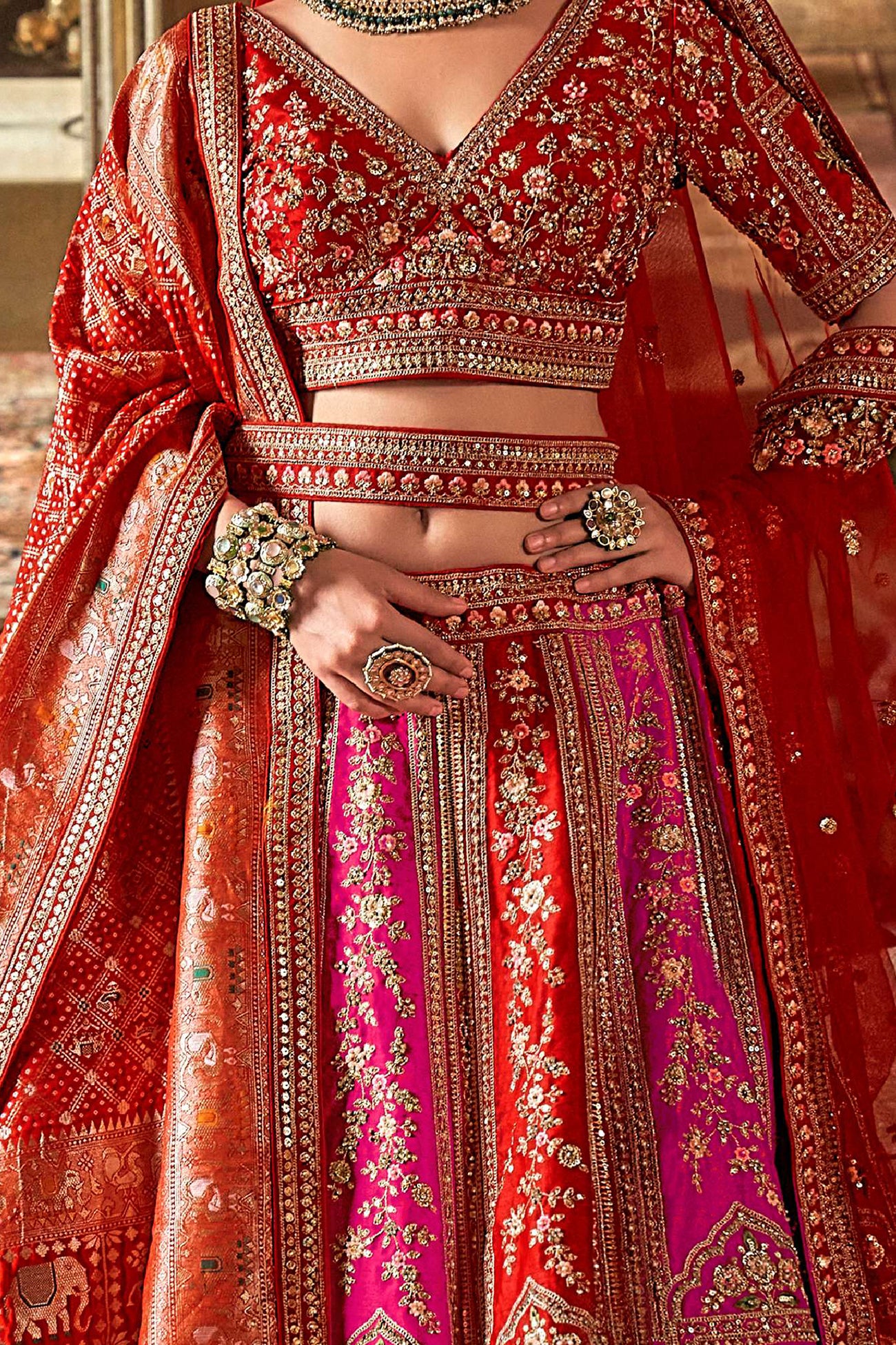 This elegant bridal lehenga is crafted from luxurious silk fabric in a rich red hue with contrasting pink panels, creating a striking and regal effect. The lehenga is heavily embellished with zari, sequins, and resham embroidery, arranged in floral vines and intricate temple-inspired motifs.