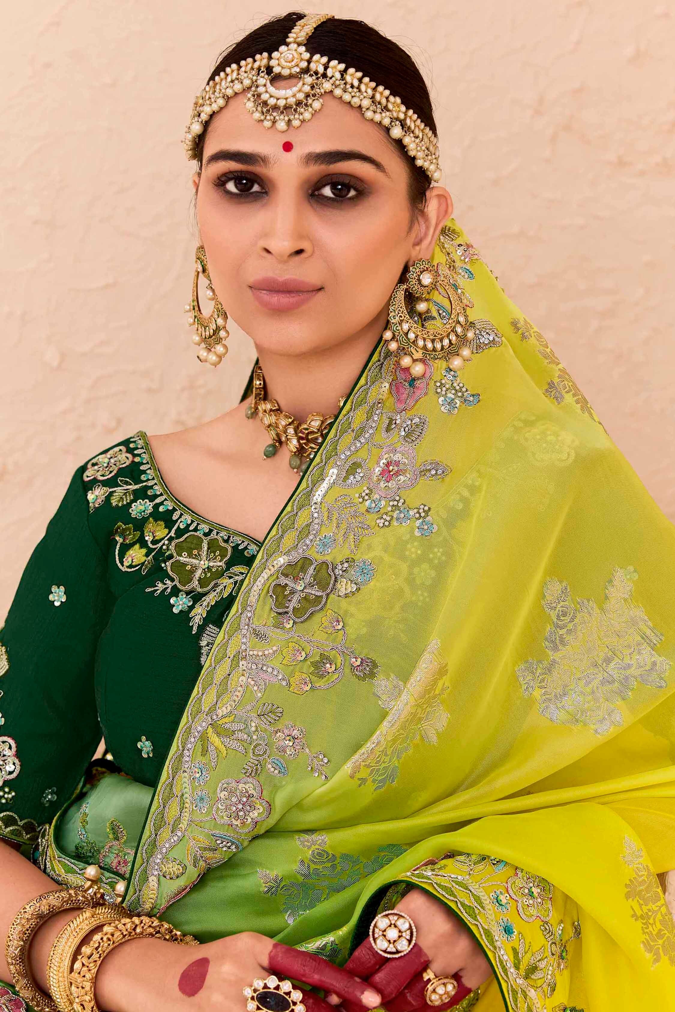 Completing the ensemble is a complementary green silk blouse piece adorned with matching embellishments. Tailor it to your desired fit and create a personalized style that will leave a lasting impression.