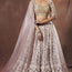 The net lehenga features a stunning lilac base layered with intricate off-white floral thread embroidery that flows gracefully across the entire flare. The hemline is adorned with heavily embroidered horizontal panels that include foliage and lattice patterns, giving it a regal finish.