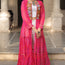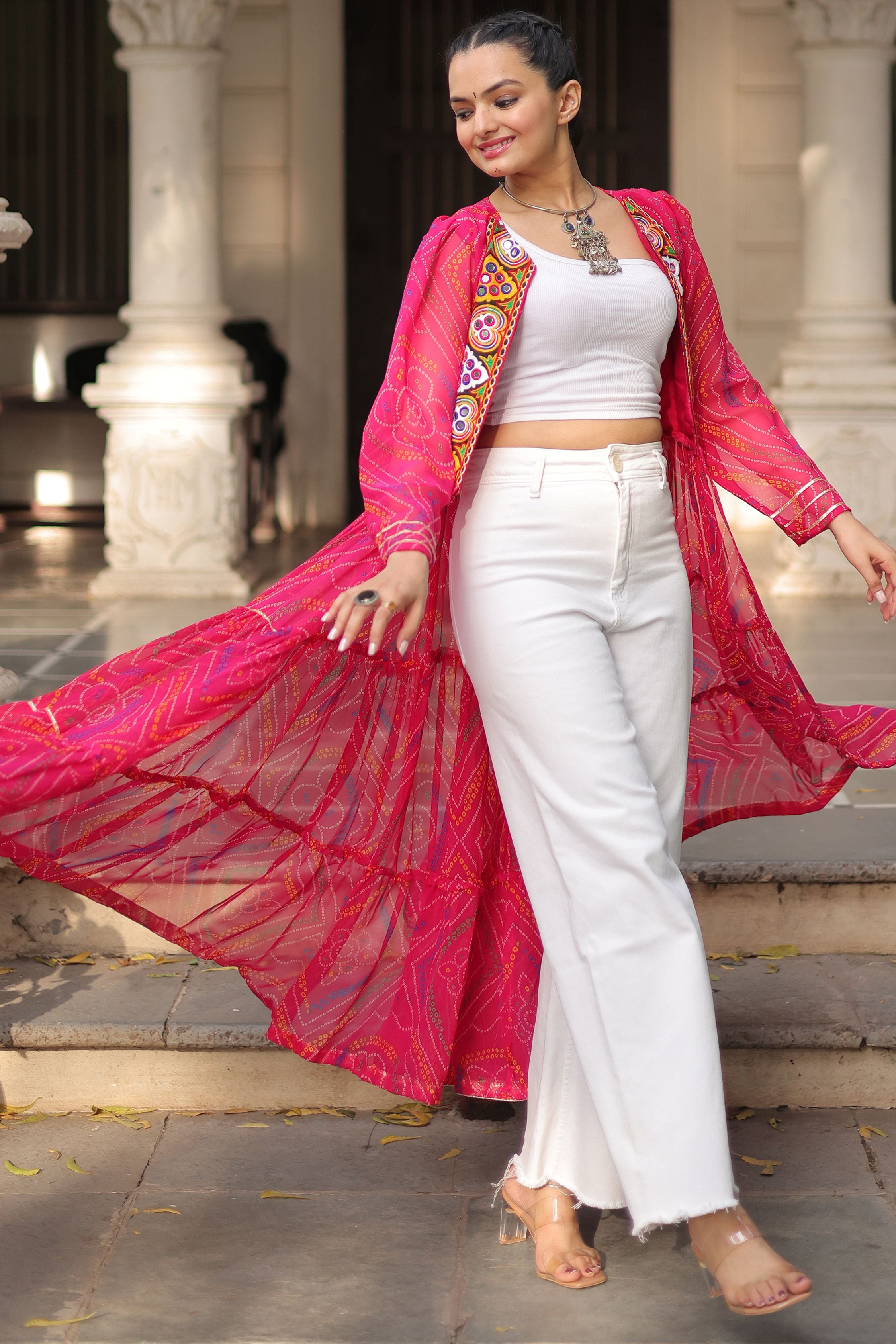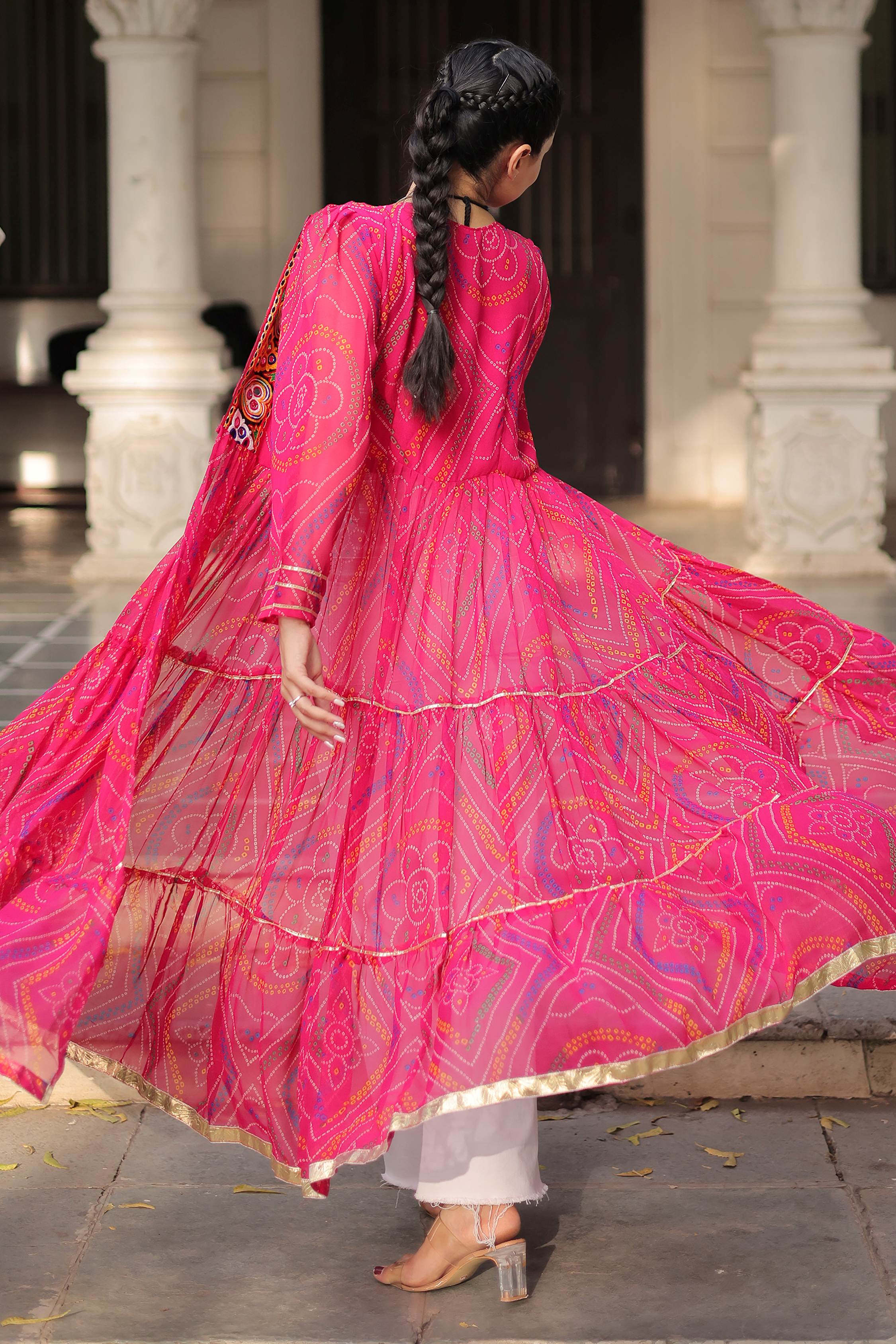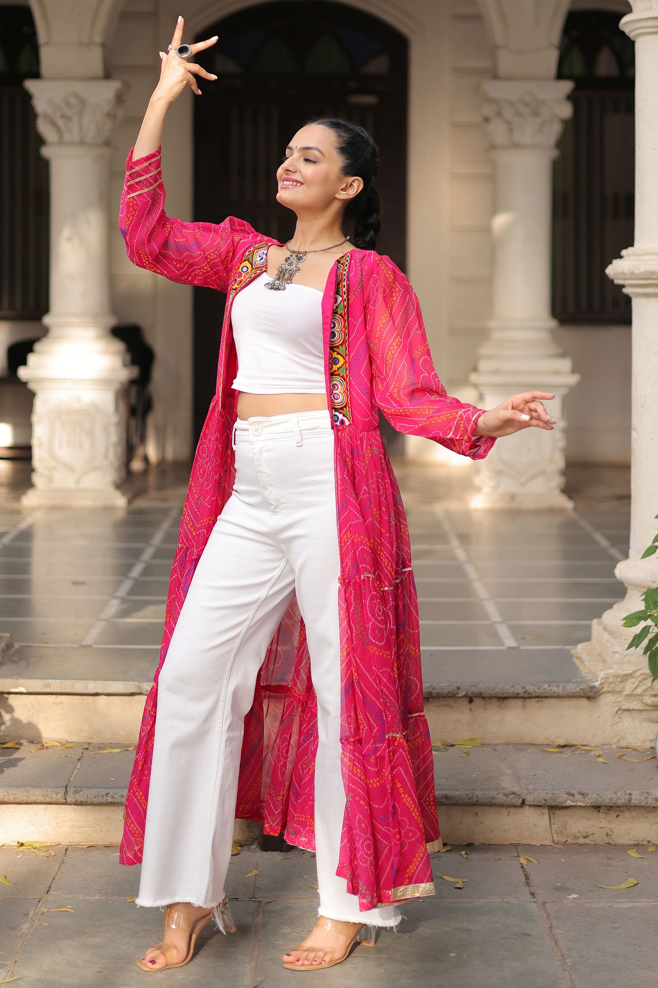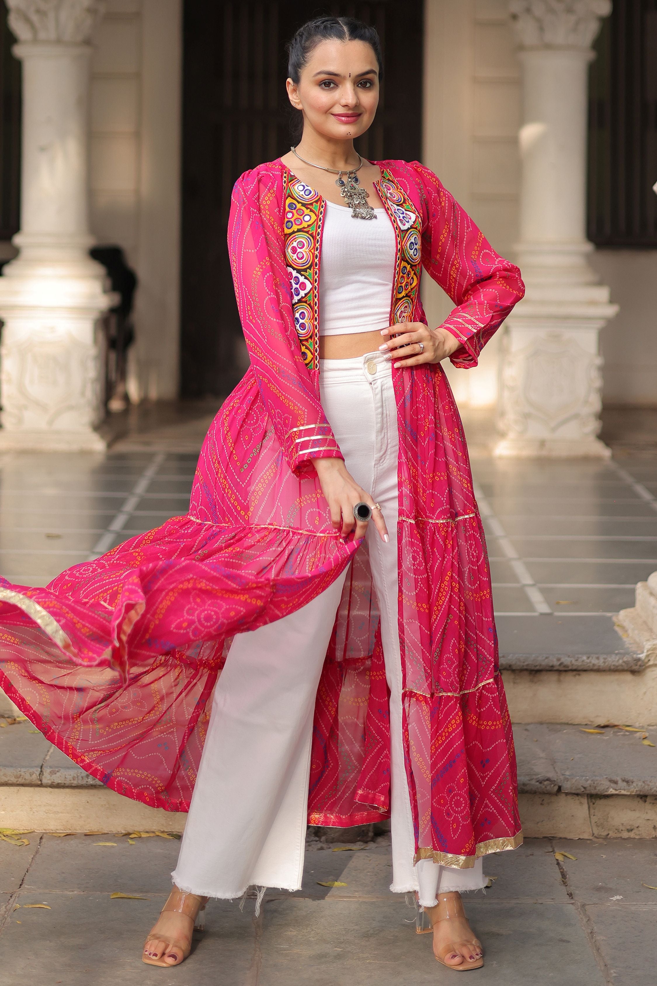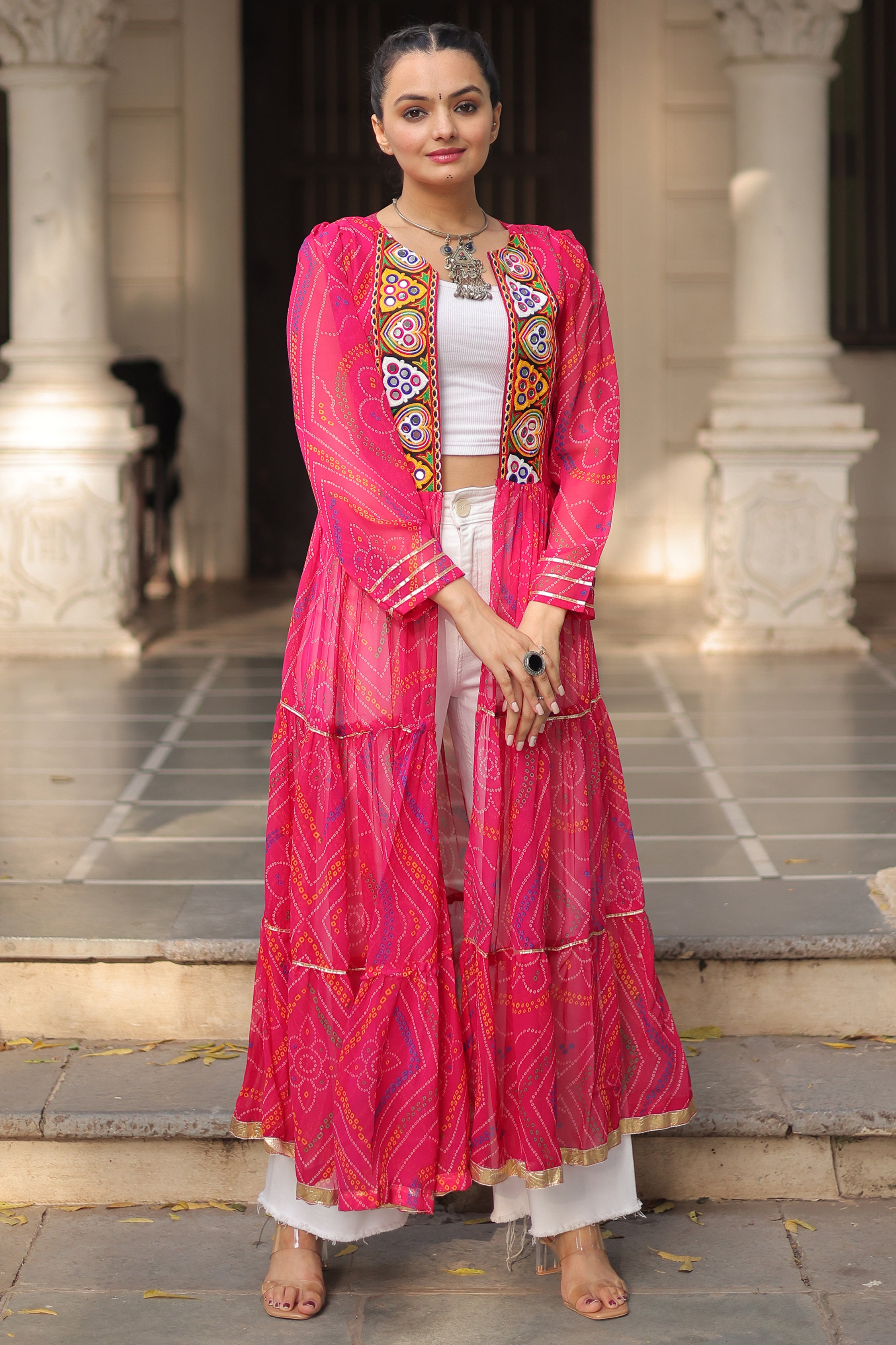 The pink georgette jacket is adorned with intricate multi-colored embroidery featuring heart-shaped and circular motifs, highlighted with mirror work and bright thread detailing. Its flowing bandhani-inspired pattern and golden hemline add elegance, while the sheer layered fabric brings movement and charm.