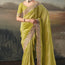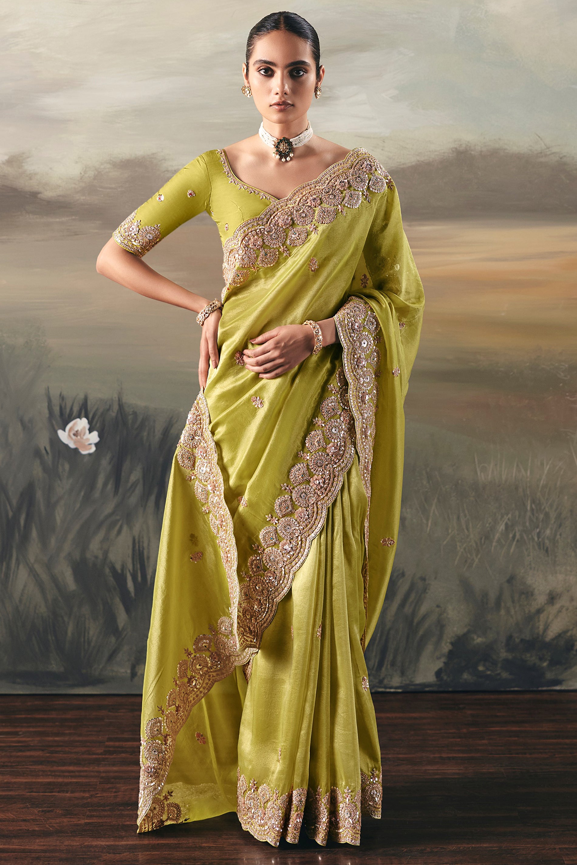 This elegant green saree features a luxurious, silky texture adorned with delicate sequins floral motifs across the drape. The beautifully scalloped border showcases rich golden embroidery, adding a regal touch perfect for festive and wedding occasions.