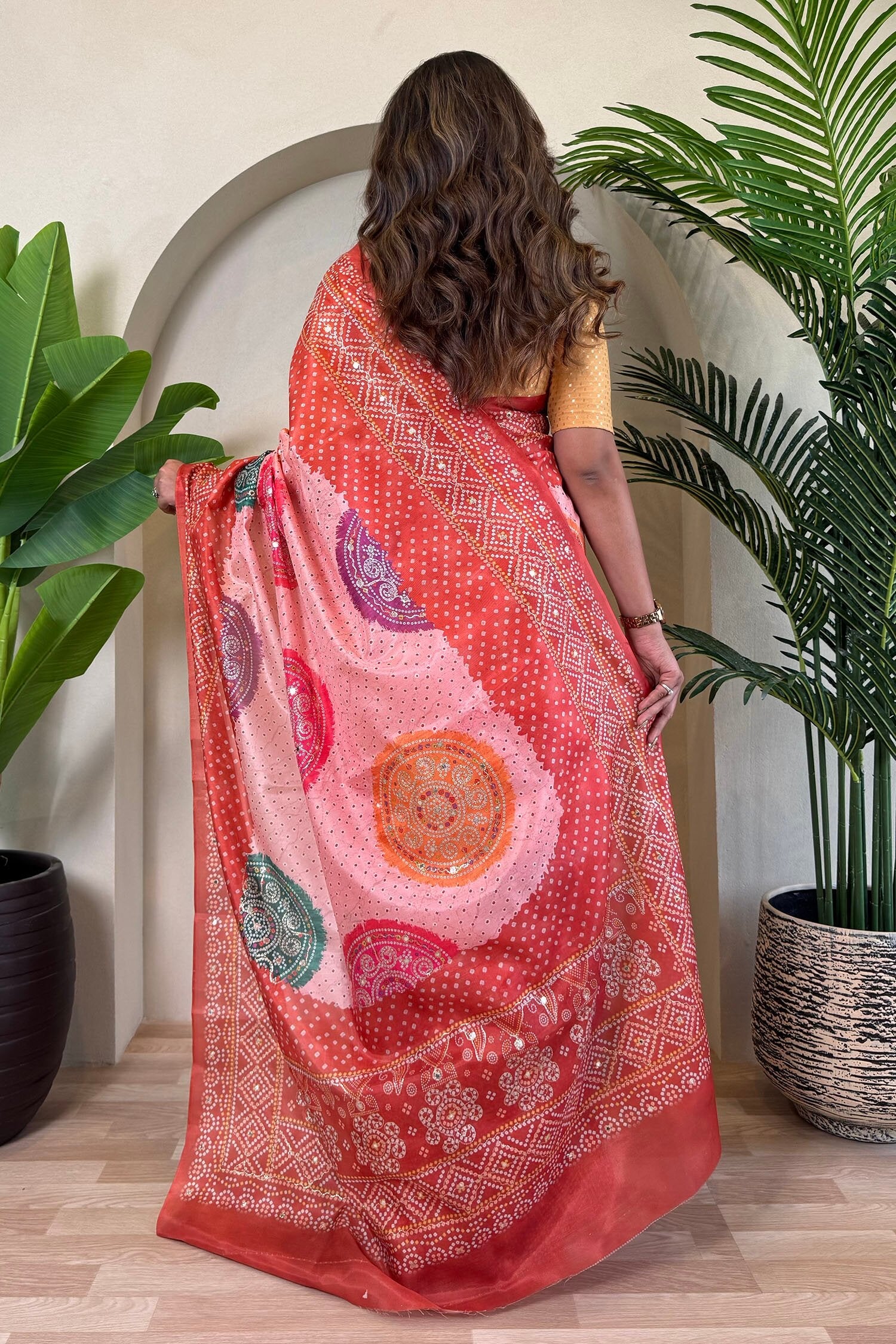 Fantastic Peach Bandhani Printed Tissue Silk Function Wear Saree