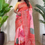 The saree is paired with a contrast printed silk blouse featuring delicate embroidery, enhancing the overall look. The unstitched blouse material, shown in the video, allows for a tailored fit that blends timeless elegance with comfortable wear.