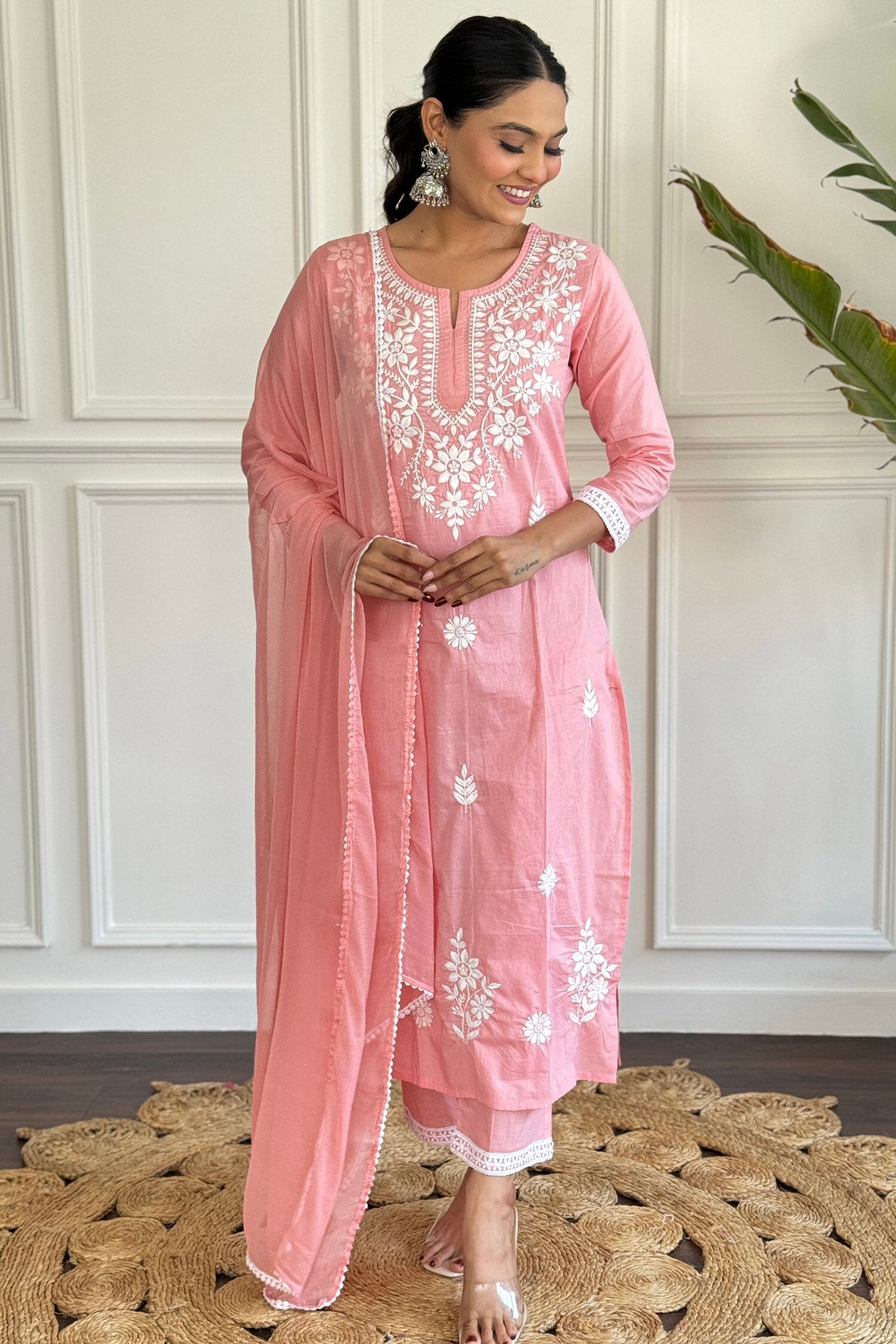 Fantastical Pink Embroidered Cotton Pant Suit With Dupatta