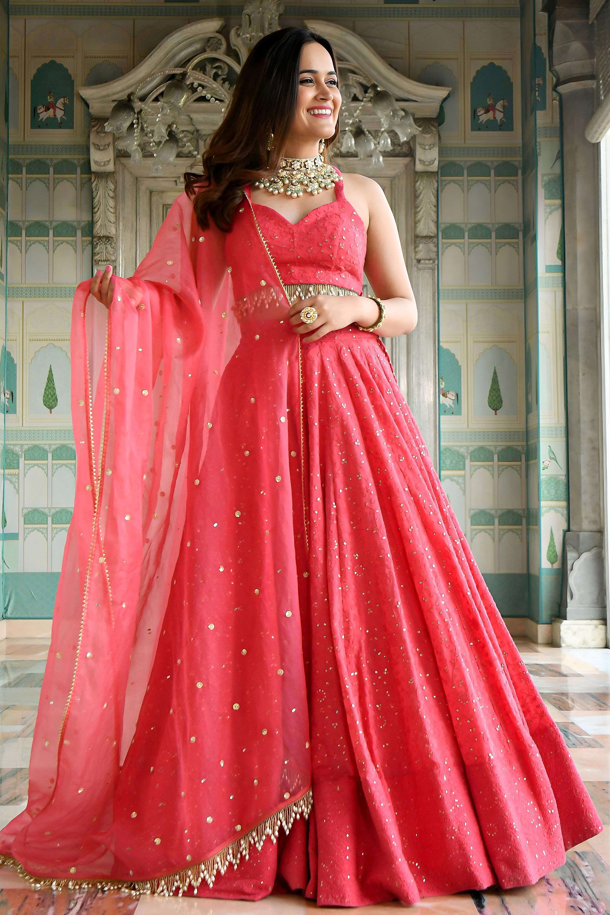 The lehenga features a vibrant and festive pink shade that brings a joyful, youthful charm to the look. Adorned with shimmering sequin embellishments scattered throughout, it creates a glamorous sparkle with every movement. The voluminous flare enhances the silhouette beautifully, making it perfect for weddings, sangeet nights, and celebrations.