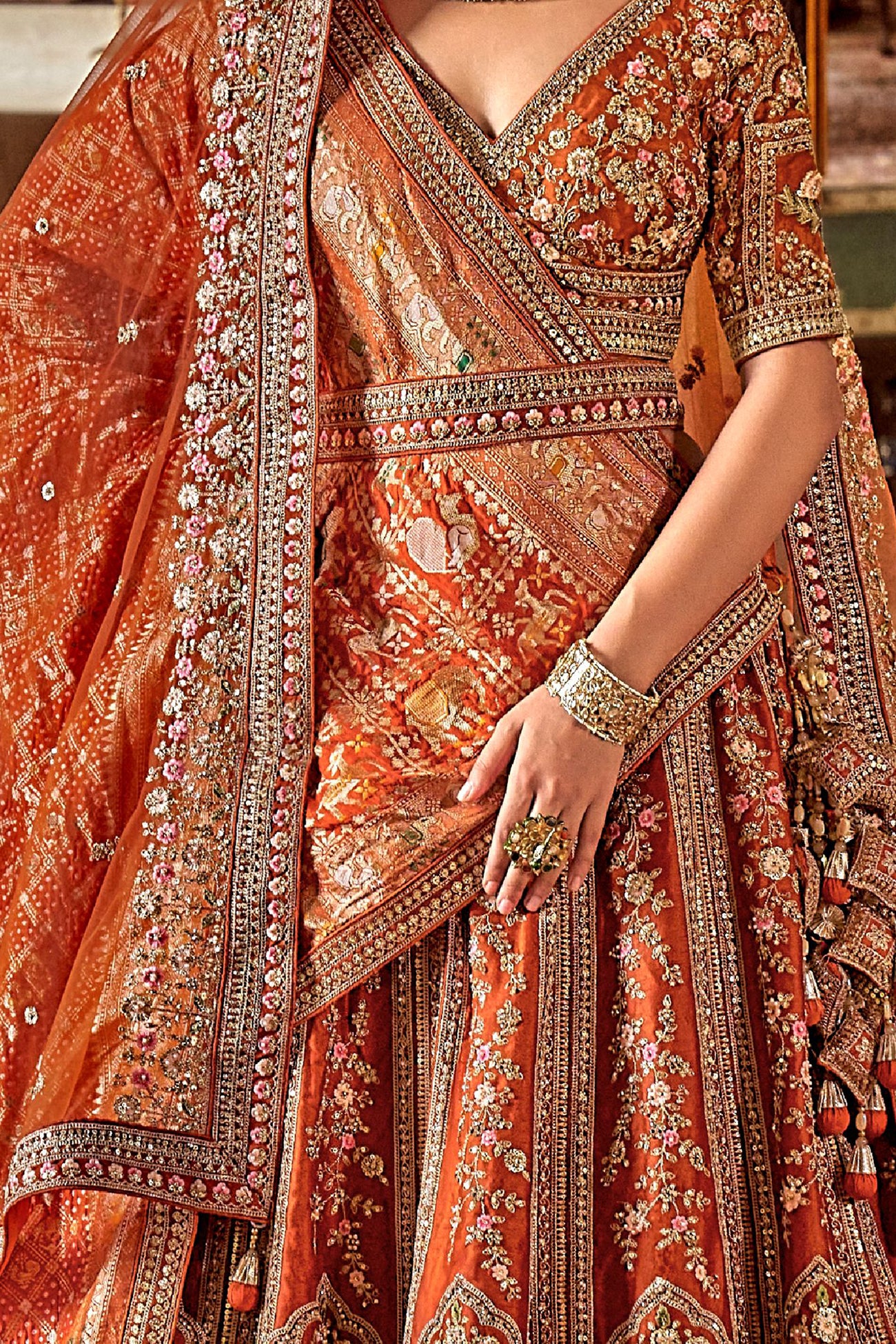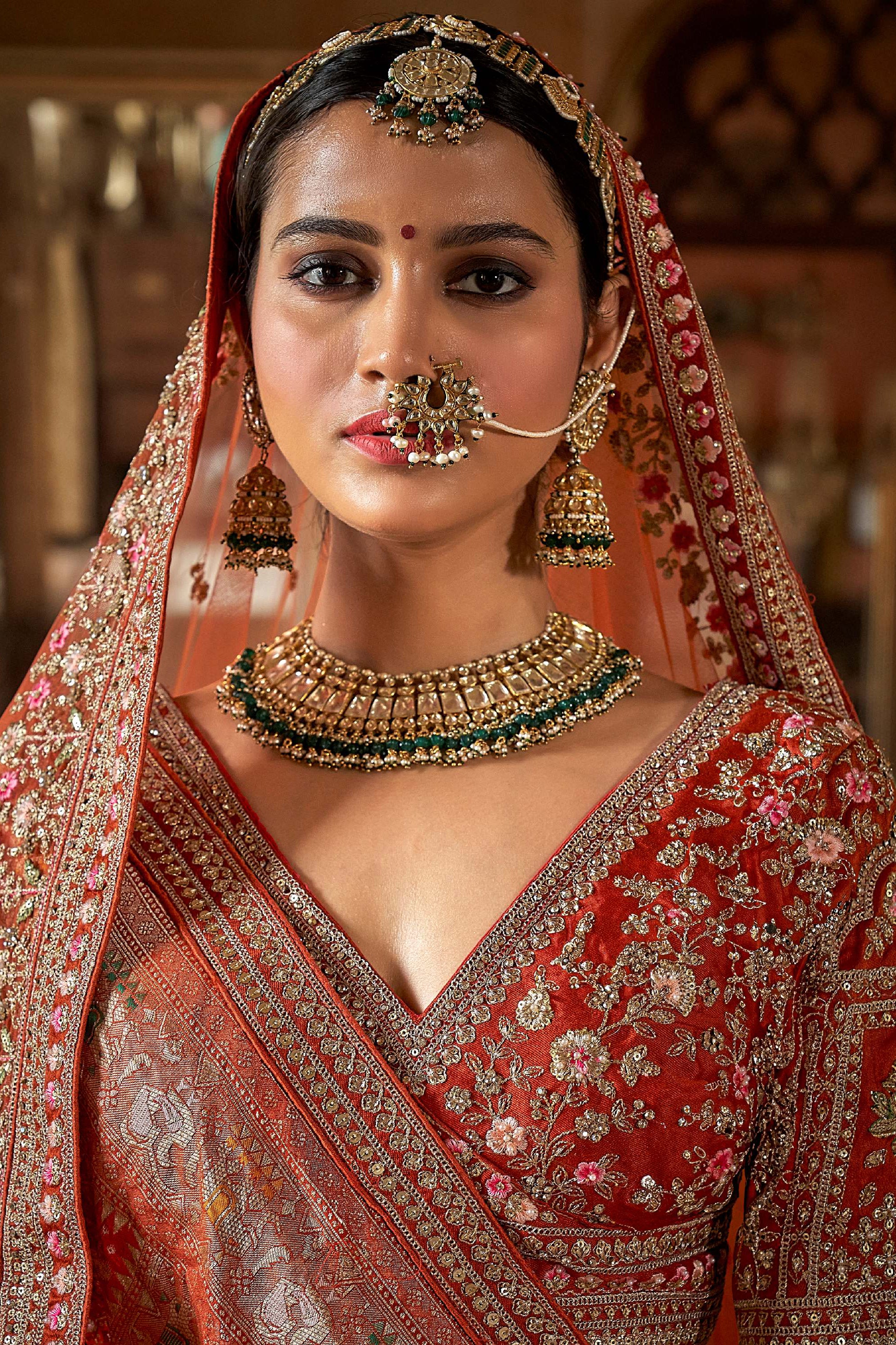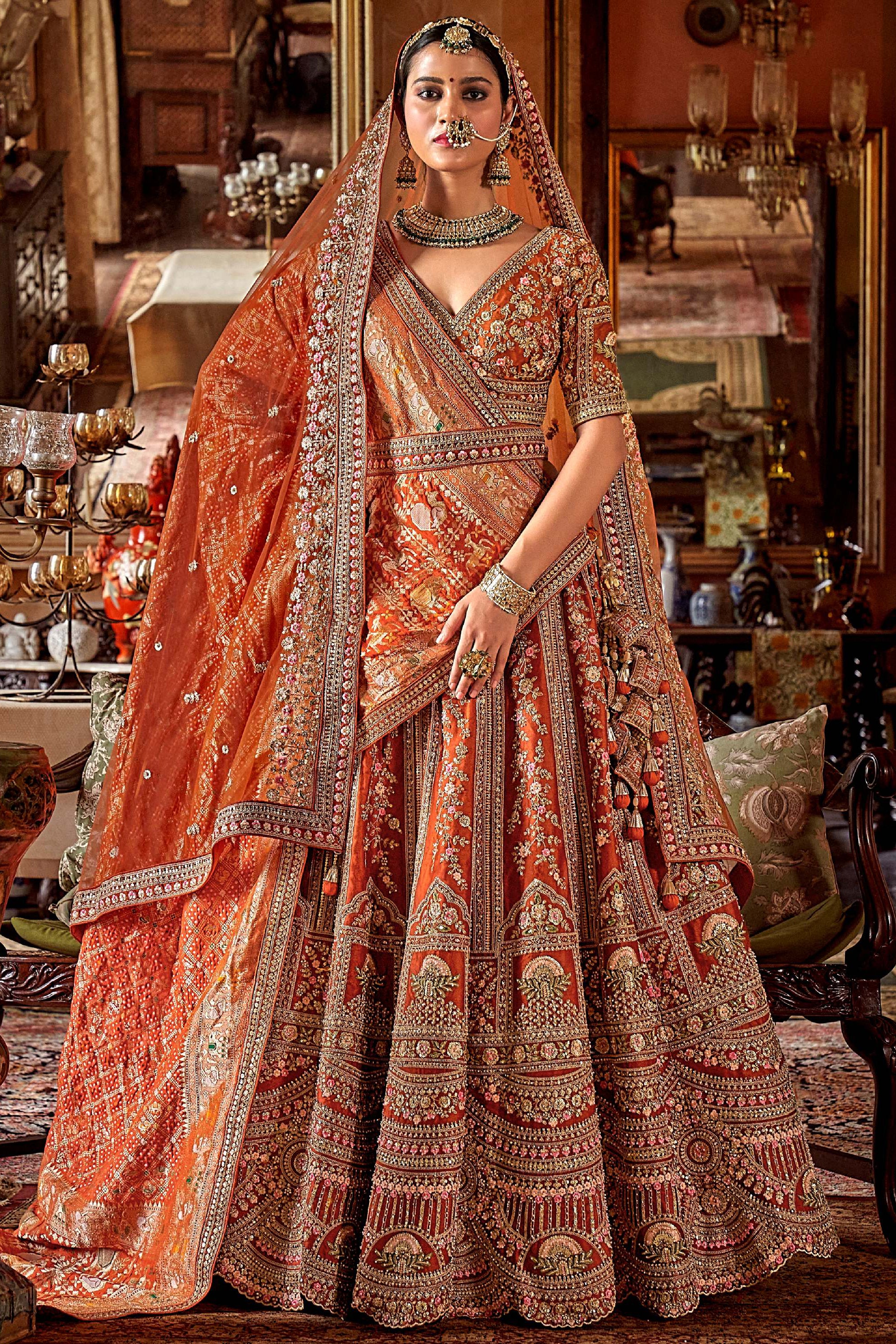 This exquisite bridal lehenga is tailored from luxurious silk fabric in a striking burnt orange hue, symbolizing warmth and festivity. The lehenga is adorned with rich zari, sequins, and floral embroidery that cascade beautifully in vertical motifs. The intricate temple-inspired borders and heavily embellished hemline add grandeur, making it a true masterpiece for traditional weddings.
