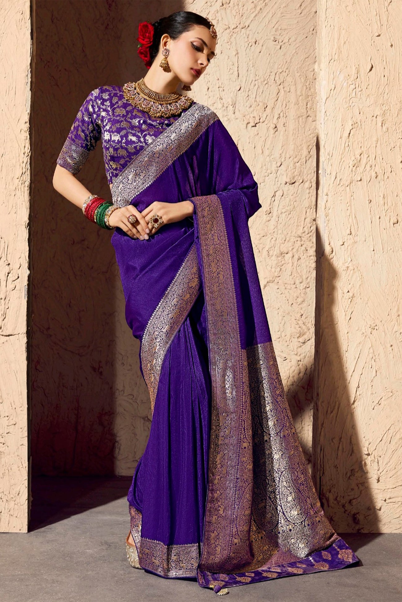 This purple saree features rich banarasi-style weaving with intricate golden zari motifs that beautifully illuminate the deep, regal fabric. The border is adorned with detailed floral and paisley patterns, adding a traditional charm and premium elegance. The pallu showcases dense zari artistry with heritage-inspired designs, giving the saree a majestic and opulent appeal perfect for weddings and grand celebrations.
