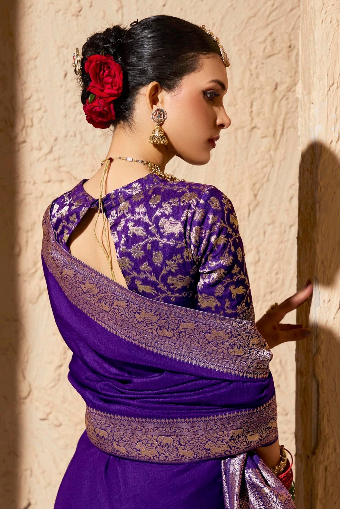 The matching purple blouse elevates the look with its exquisite brocade work depicting traditional motifs and animal figure patterns woven in shimmering gold. Its fitted silhouette and half sleeves create a refined and sophisticated appearance that pairs flawlessly with the ornate saree.