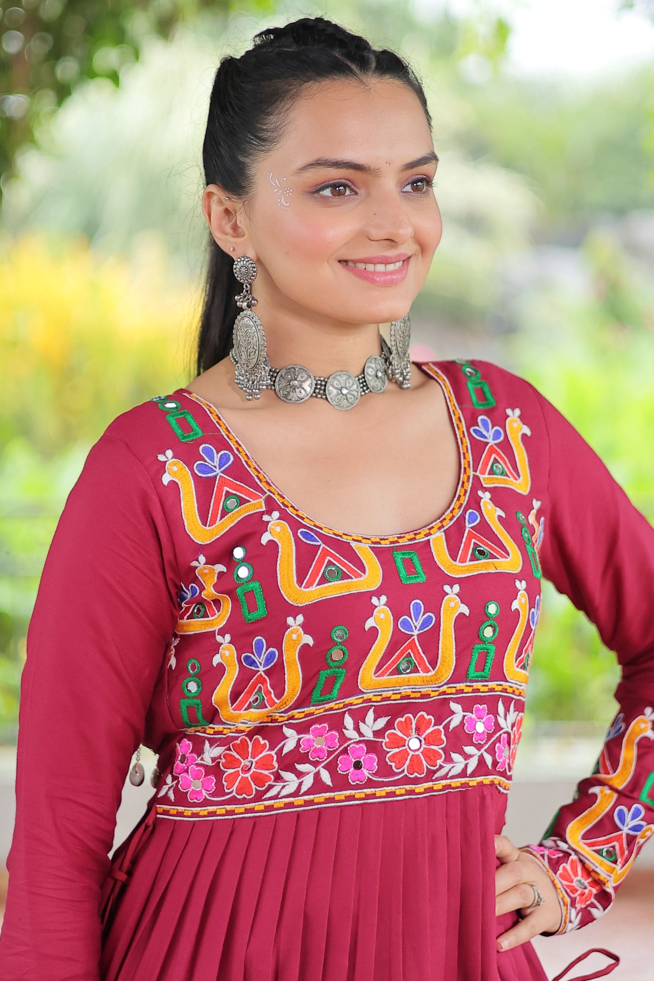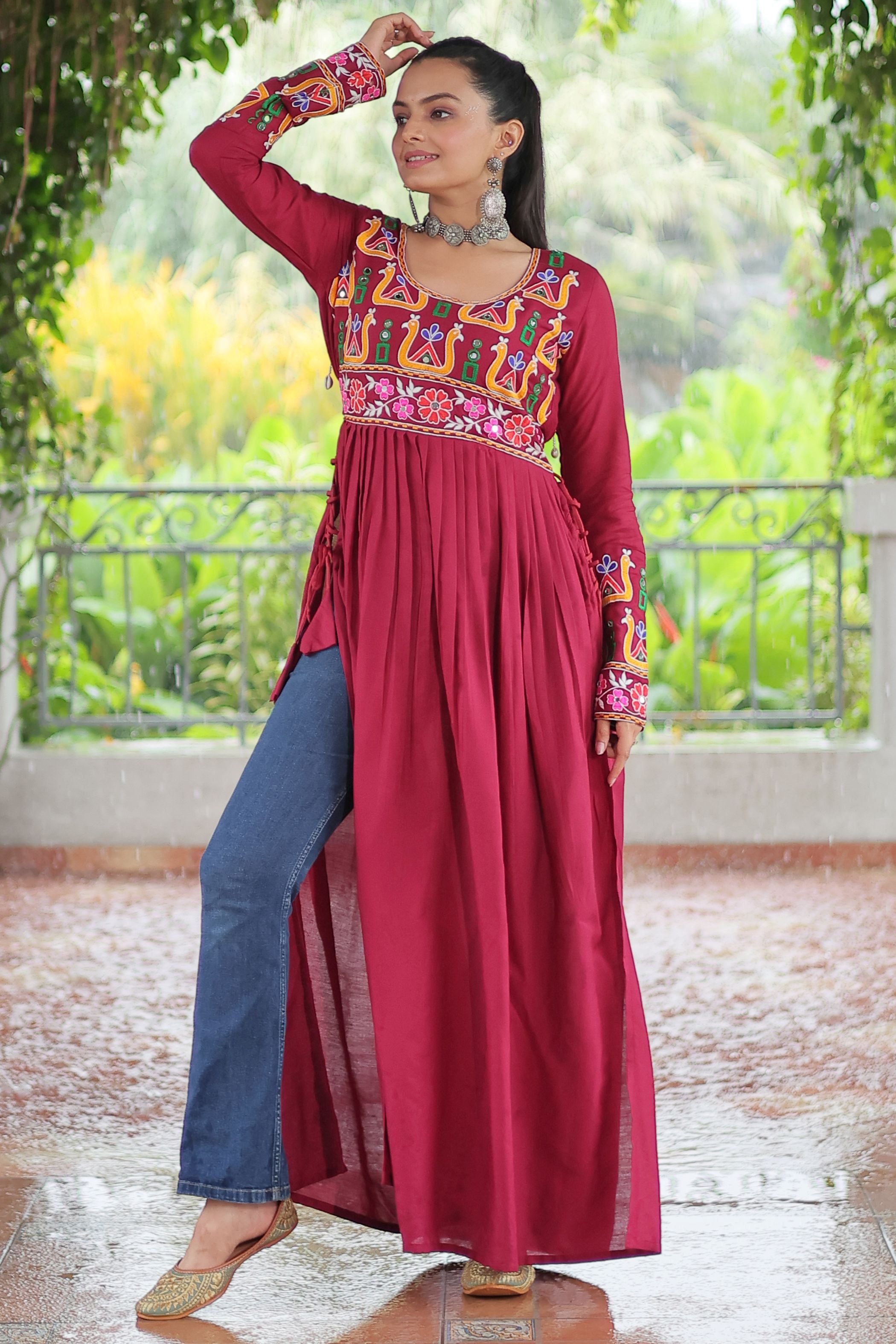 Make a bold style statement with this red color rayon Nayra cut kurti, beautifully embellished with traditional Kutchi Gamthi work. The vibrant red hue paired with intricate handwork adds a festive charm, while the soft rayon fabric ensures comfort throughout the day. With its contemporary Nayra cut silhouette, this kurti is perfect for cultural gatherings, festive celebrations, or casual outings, blending ethnic elegance with modern flair.