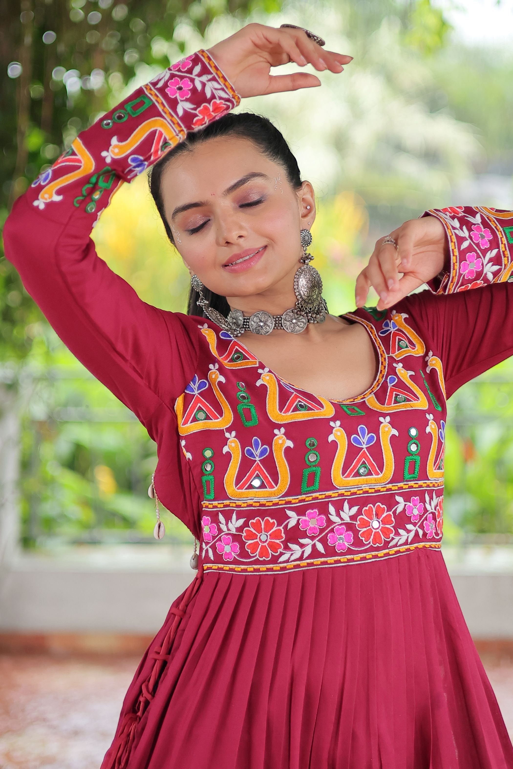 Precious Red Gamthi Work Rayon Festival Wear Nayra Cut Kurti