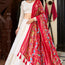 To complete the look, a bold red dola silk dupatta is included, showcasing vibrant Patola prints along with a rich gotta patti lace border and decorative tassels. The vivid contrast of the dupatta adds a festive splash of color, making this ensemble a striking blend of traditional artistry and contemporary flair.