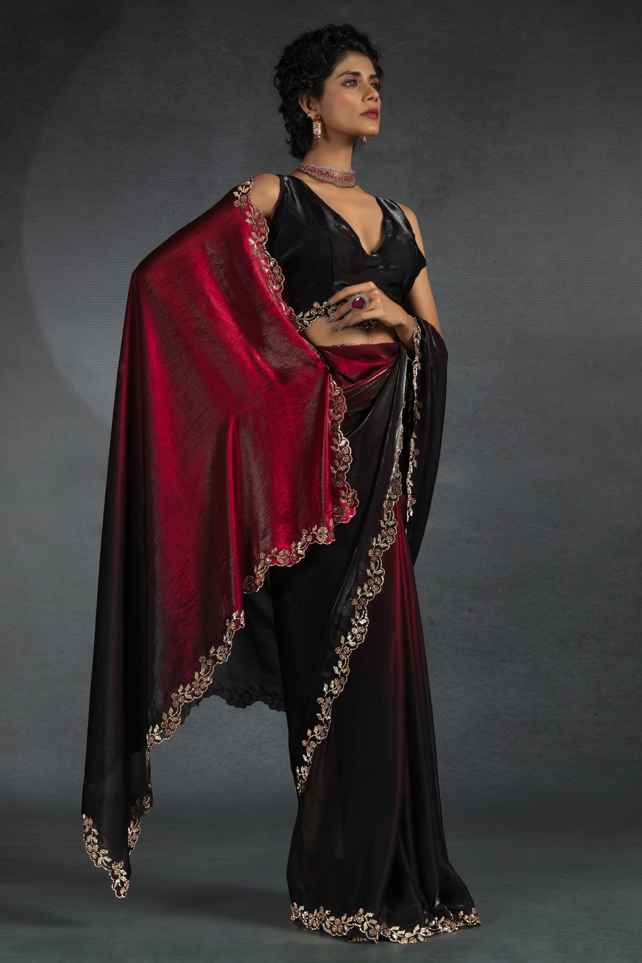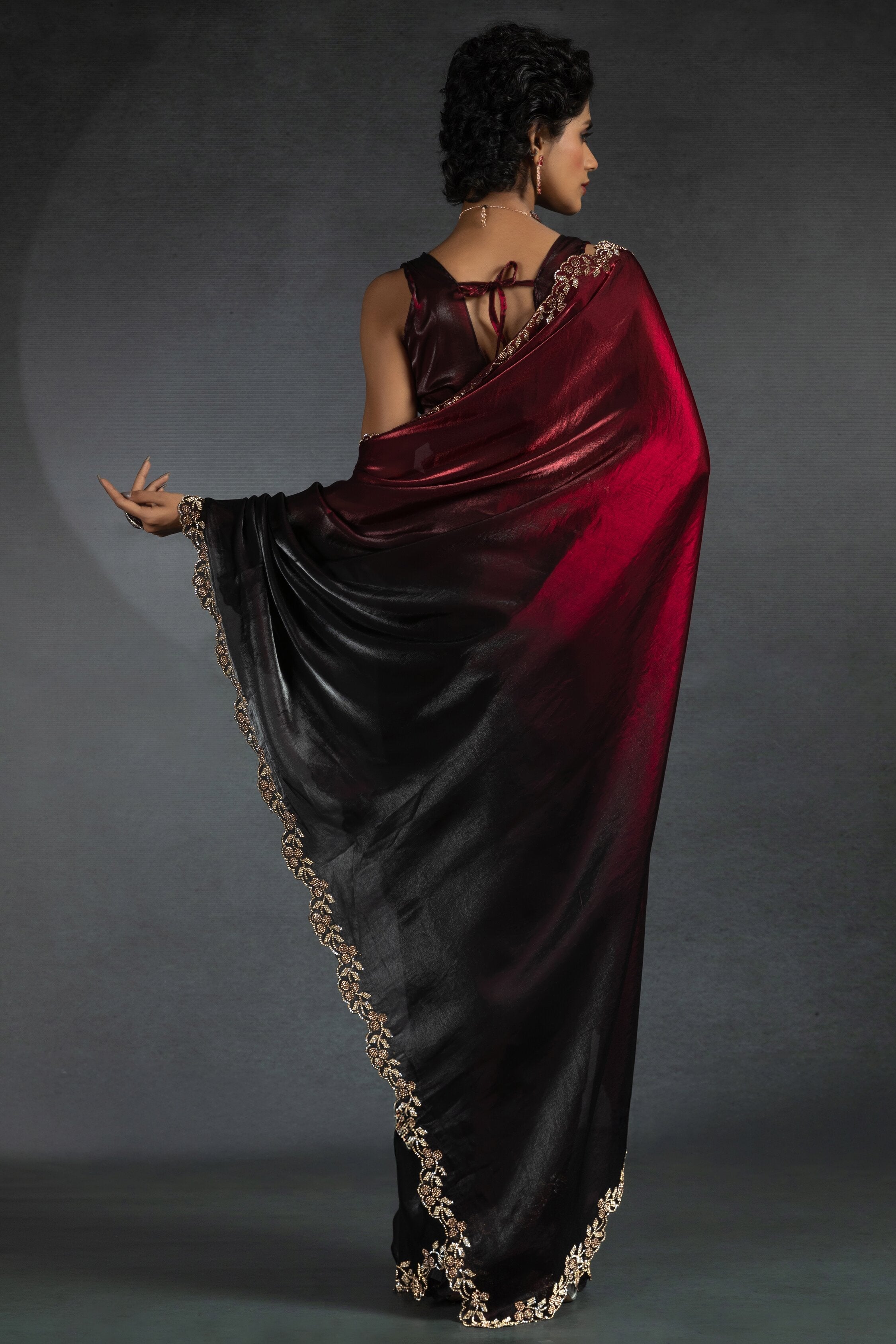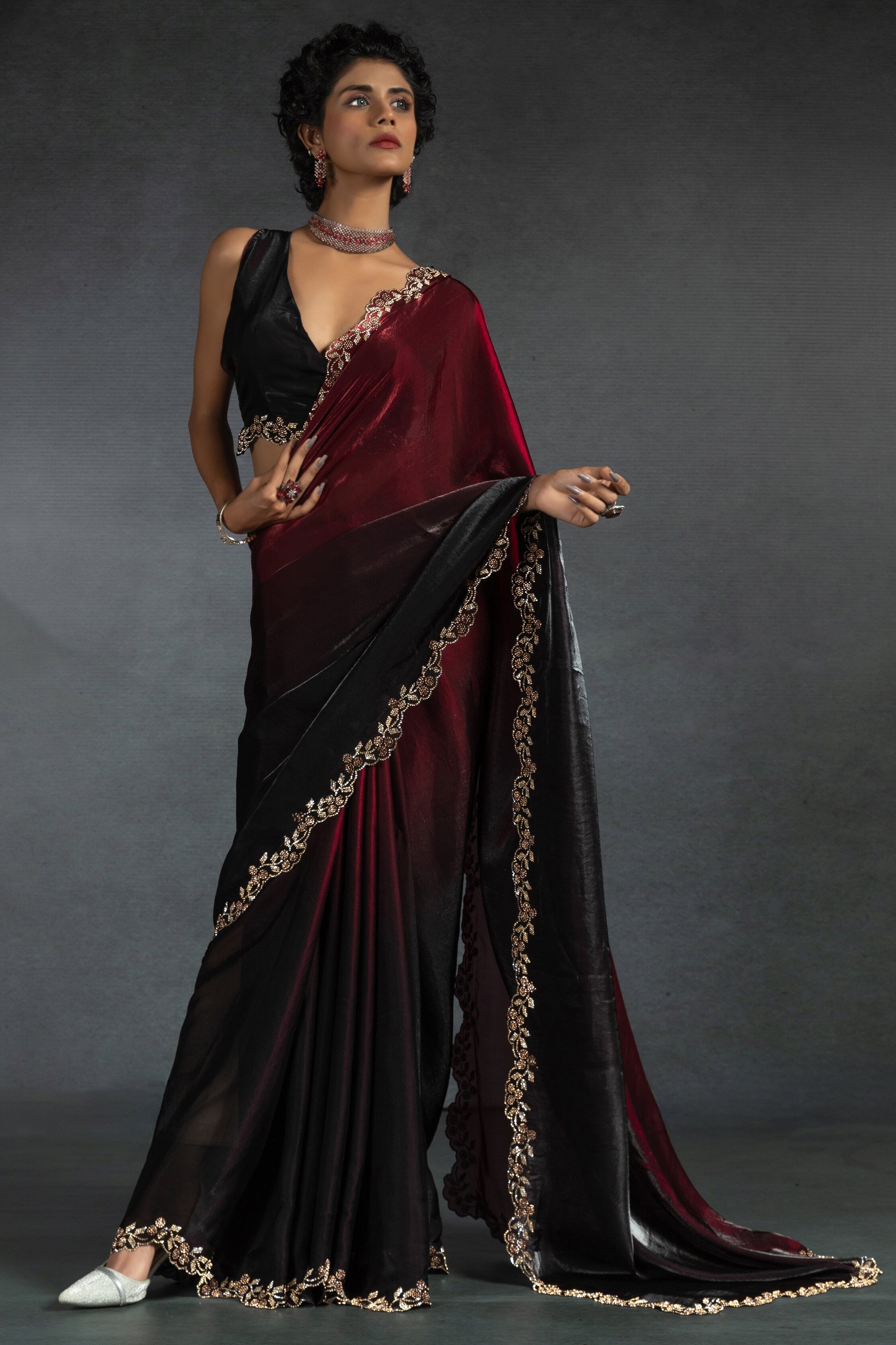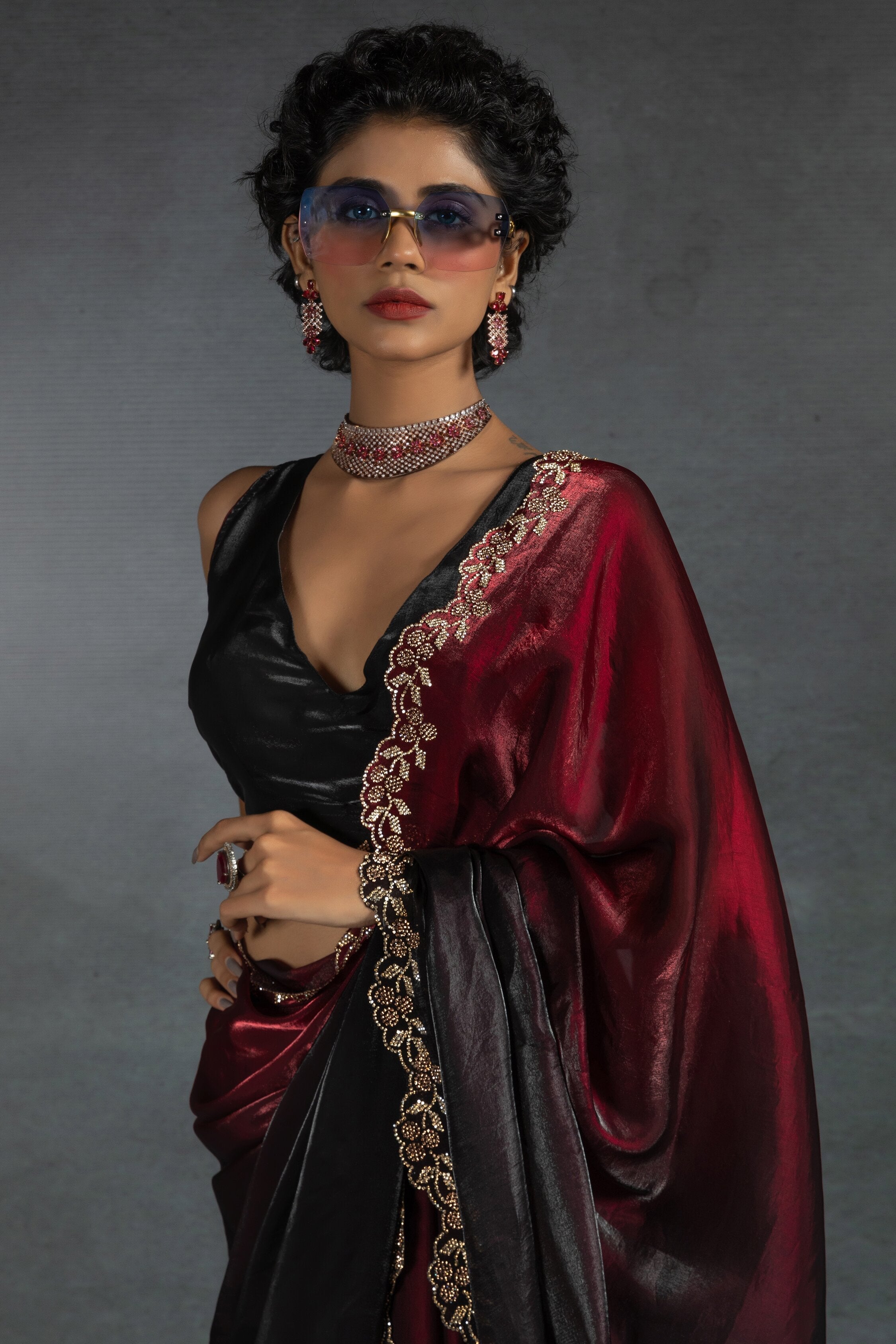 Shine at weddings or receptions with this dazzling red satin saree, beautifully adorned with intricate diamond and zarkan work. Its rich hue and delicate detailing create a luxurious look, perfect for making a memorable entrance.
