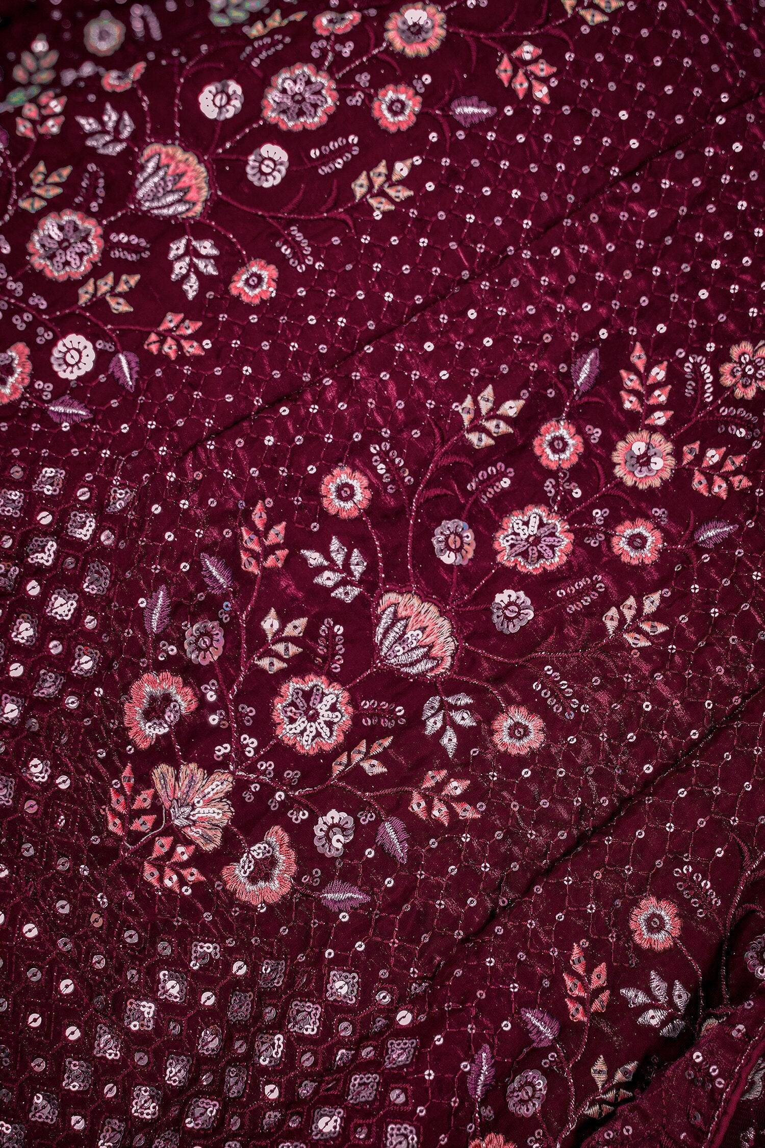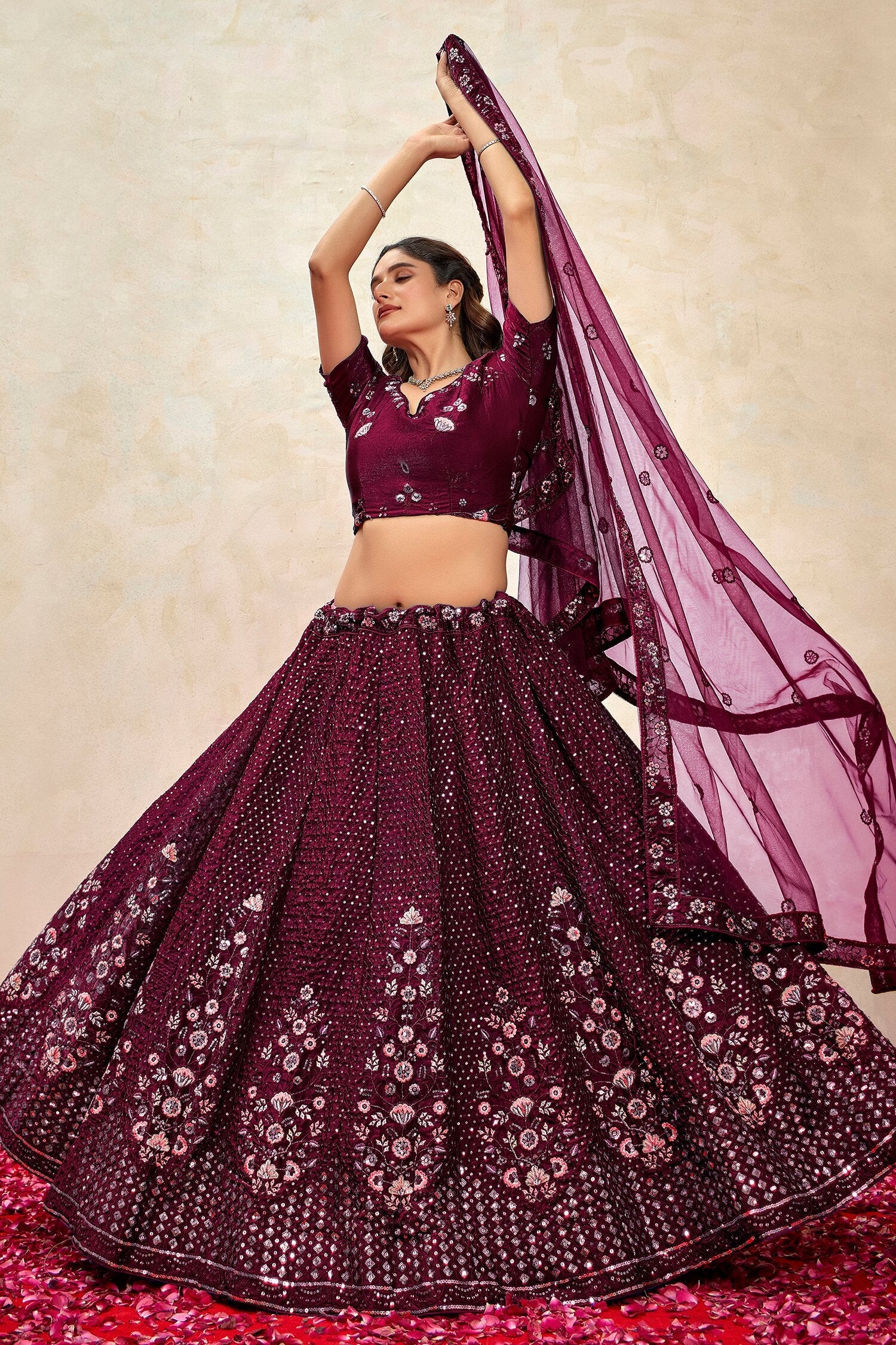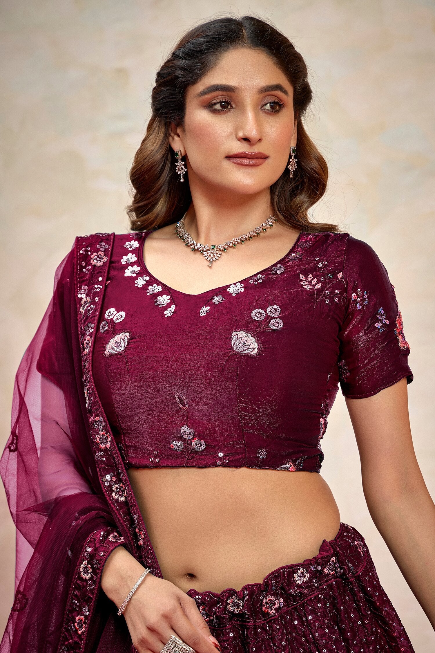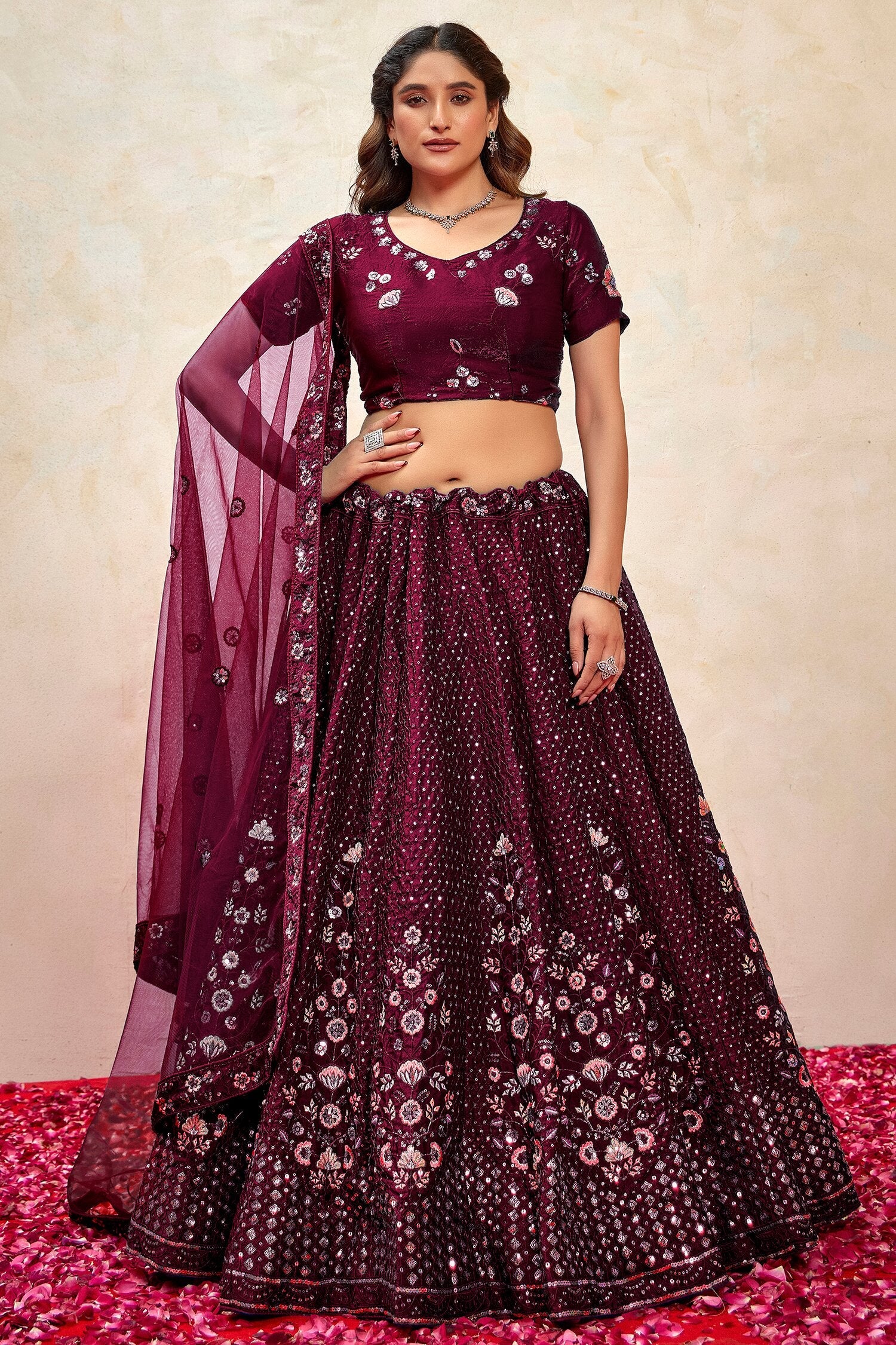 This wine-colored lehenga choli set is a showstopper, featuring intricate sequin and thread embroidery on delicate net fabric. The semi-stitched lehenga boasts a generous 3.5-meter flair, ensuring a dramatic and unforgettable entrance at any wedding or festive celebration.