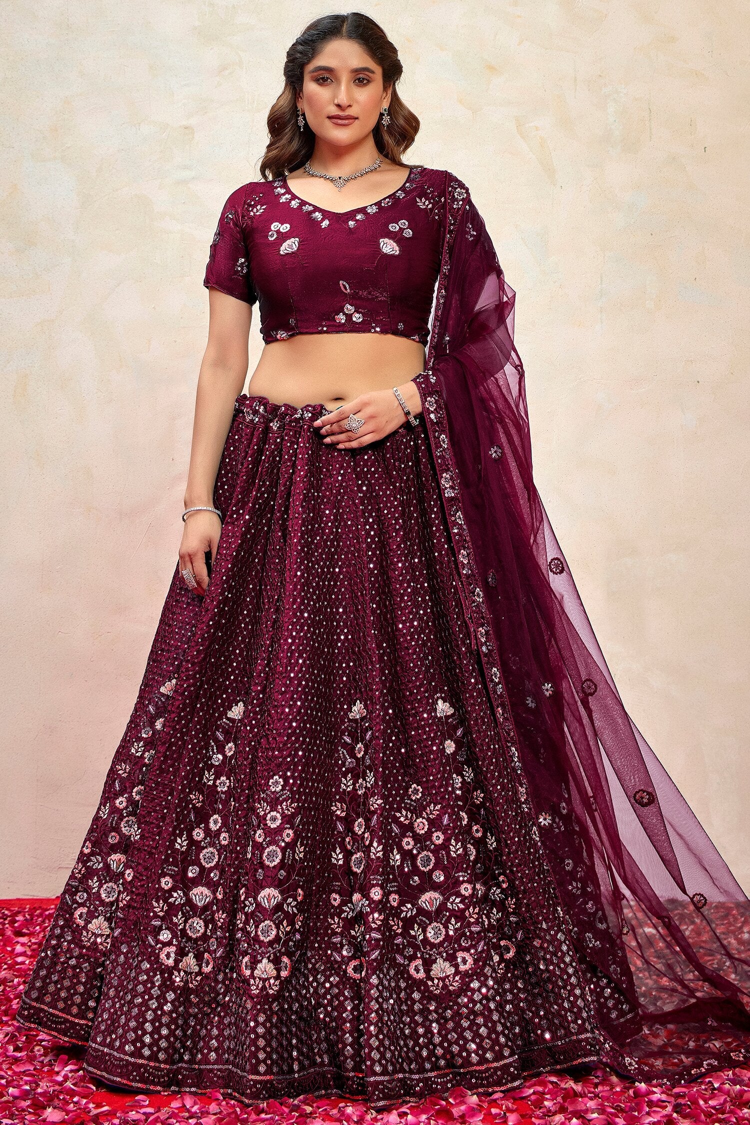 Winsome Wine Thread Embroidered Net Lehenga Choli With Dupatta