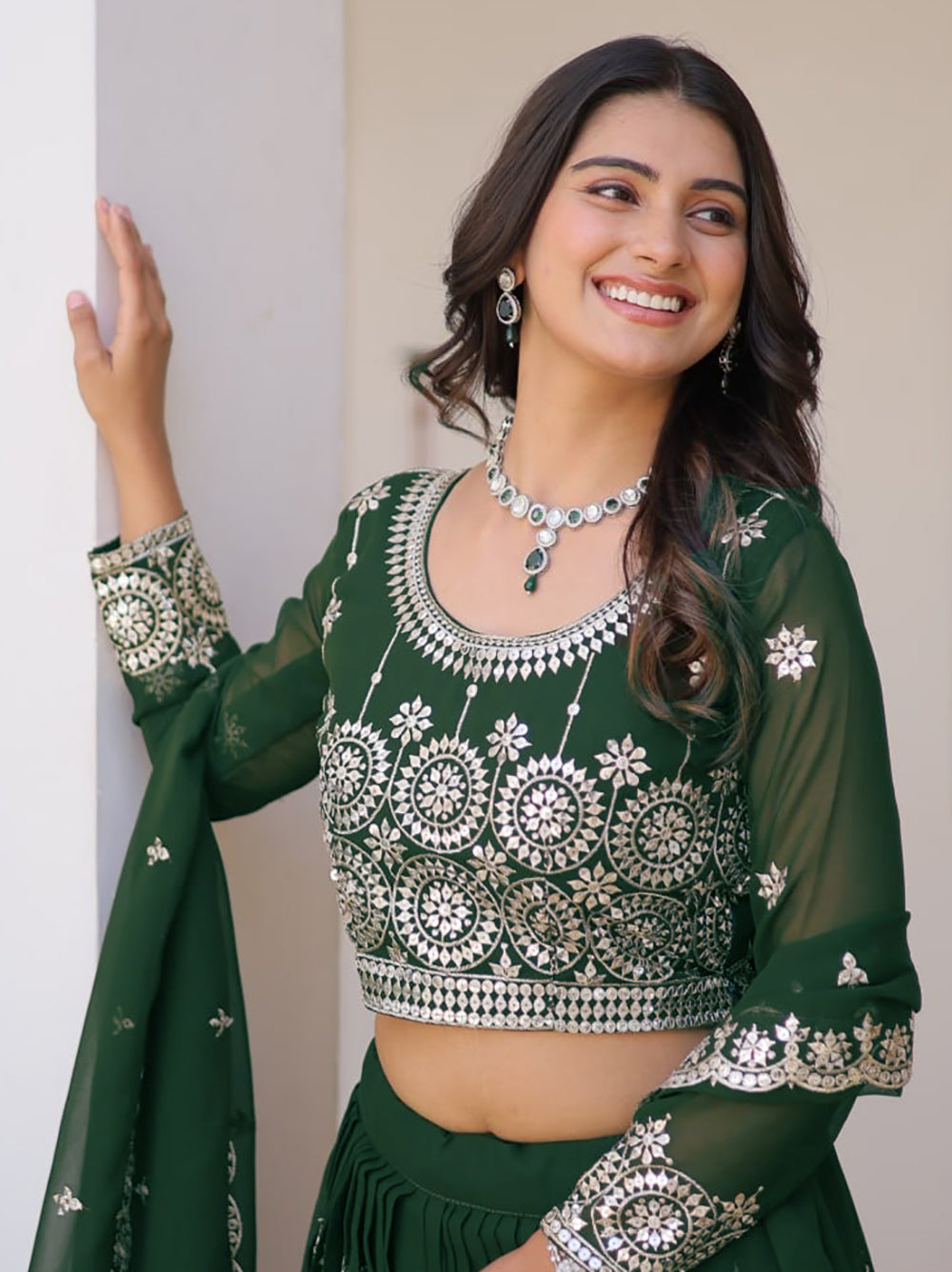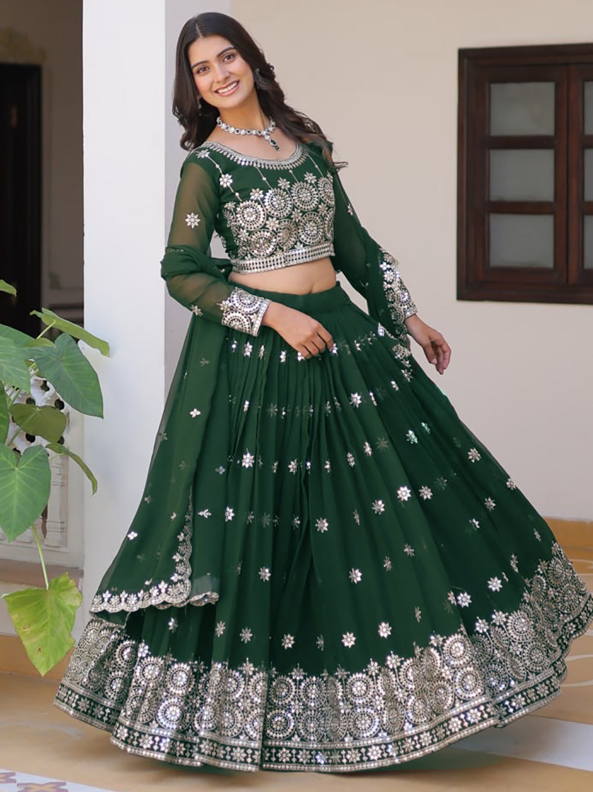 Make a stunning impression at your mehendi ceremony with this exquisite ensemble featuring an olive-green lehenga. Crafted from heavy fox georgette, the lehenga is designed to flow beautifully, offering a flair of 3.50 meters that will make you feel like royalty on your special day.