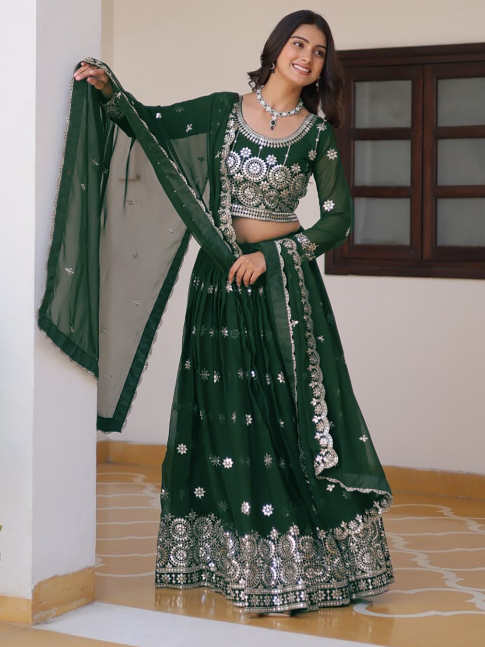 The vibrant olive-green choli complements the lehenga flawlessly and is tailored to perfection with embroidery and dazzling 7mm sequence work. Available in sizes that cater from M to 2XL, this fully stitched piece ensures comfort and elegance for every body type.